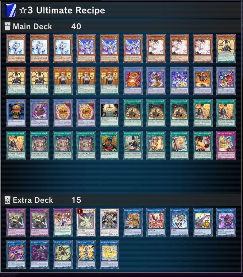 This “Nouvelles” Deck uses consecutive Ritual Summons almost as if they were part of a full-course meal. “Nouvelles” Ritual Monsters can Tribute an Attack Position monster your opponent controls and then Summon the next Ritual Monster. Keep Tributing your opponent’s monsters to dominate the field. “Chef’s Special Recipe” not only negates the activation of a Spell/Trap Card or monster effect, but also has a powerful effect that enables you to Tribute your opponent’s monsters as much as possible whenever you successfully Special Summon “Hungry Burger”, so try to use it whenever possible.”