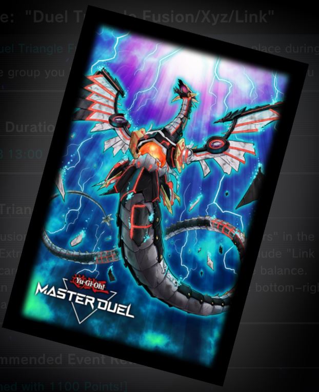The Duel Triangle Fusion/Xyz/Link has been announced for November 13th until November 25th (time zones applying). As usual, you choose a group (can be changed later), your Extra Deck is limited according to that group, and you Duel against players from the other groups. Regardless of the group, the following rewards can be obtained:
