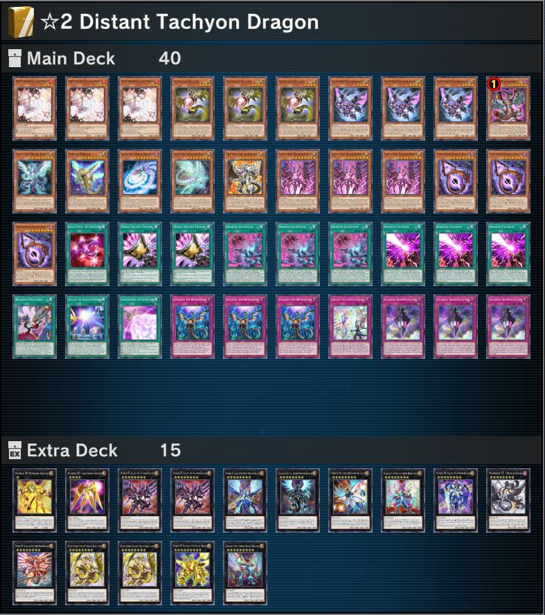 A Deck based around “Number 107: Galaxy-Eyes Tachyon Dragon”. Line up Level 8 monsters on the field and Xyz Summon “Divine Golden Shadow Dragon Dragluxion”. “Divine Golden Shadow Dragon Dragluxion” lets you add the powerful Counter Trap Card “Tachyon Transmigration” to your hand. Use the effect of “Divine Golden Shadow Dragon Dragluxion” to Special Summon “Number 107: Galaxy-Eyes Tachyon Dragon” and set yourself up to activate “Tachyon Transmigration.”