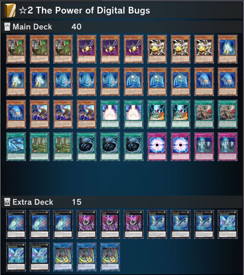 A “Digital Bug” Deck that is ever-evolving. After deploying 2 or more Level 3 LIGHT Insect monsters, Xyz Summon “Digital Bug Scaradiator”, which you can then use to Xyz Summon cards like “Digital Bug Corebage” and “Digital Bug Rhinosebus”.”