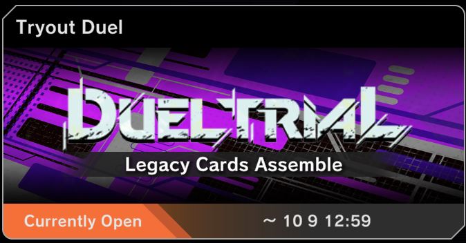 For this Tryout Duel, you can only use cards from Legacy Packs. This Tryout Duel will be available until October 9th. By winning 3 matches, you can obtain 1 pack from the newest Selection Pack, Birth of a Challenger