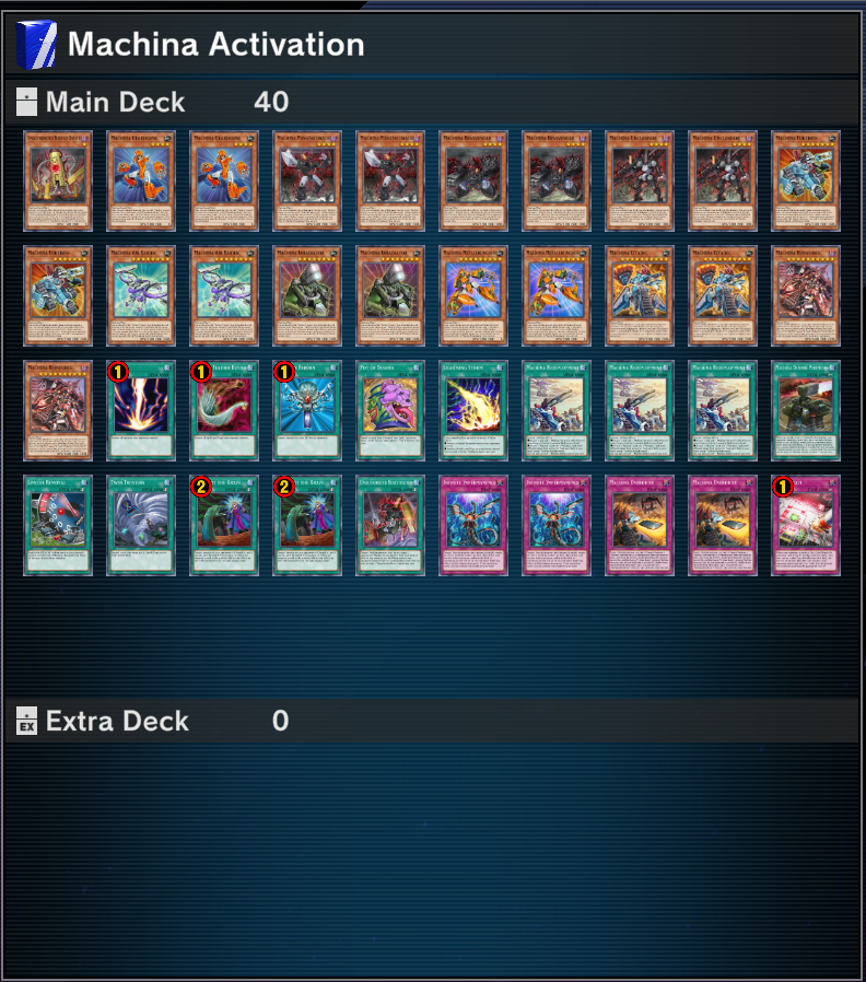 “A “Machina”-focused Deck that uses high-Level Machine-Type monsters. Prepare yourself for the powerful monsters you will Summon with “Machina Redeployment,” such as “Machina Air Raider” that can be Special Summoned by discarding a “Machina” monster from your hand, or “Machina Citadel” that can be Special Summoned from your Graveyard when a face-up Machine-Type EARTH monster on your field is destroyed by battle or by an effect.