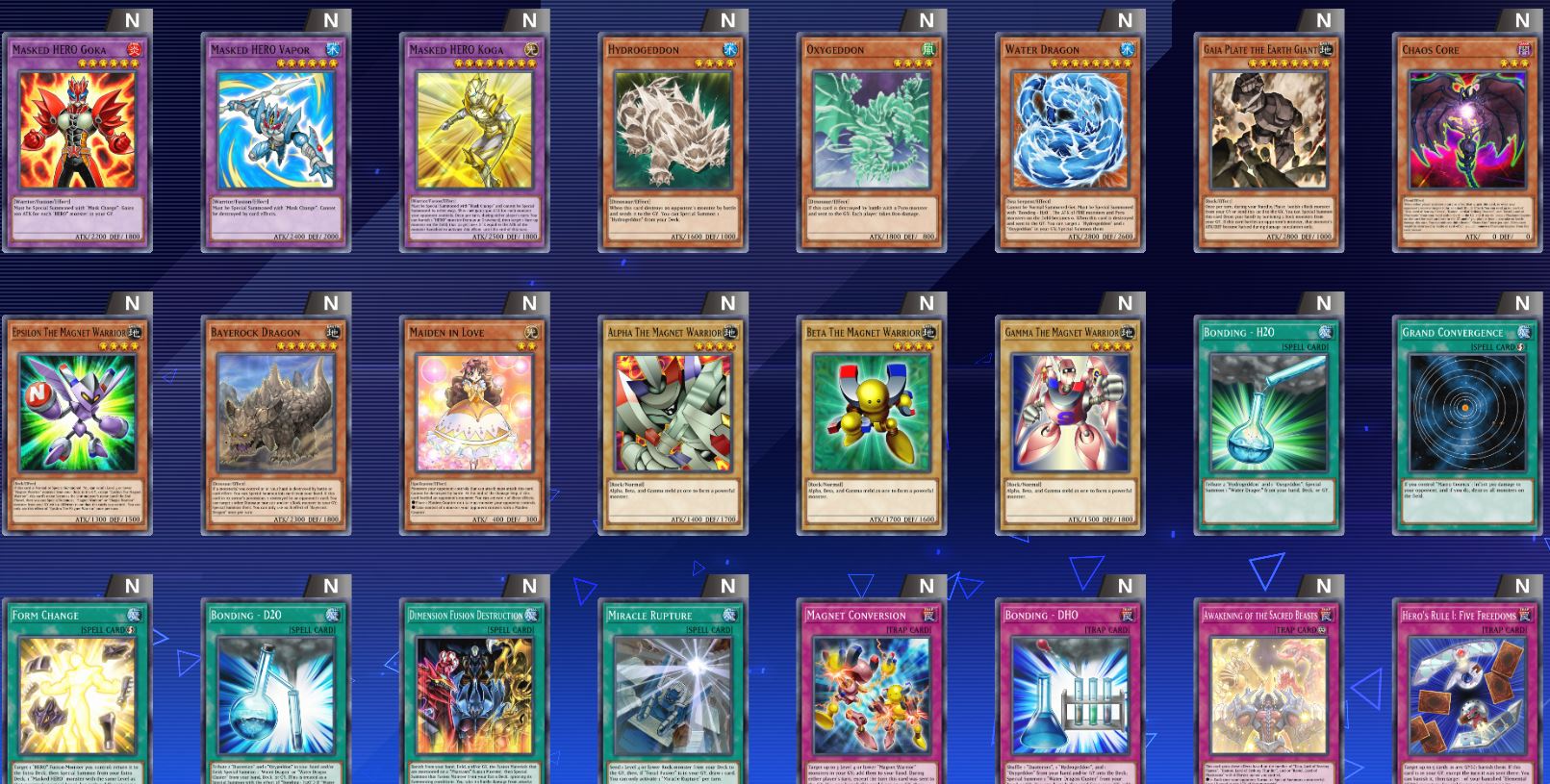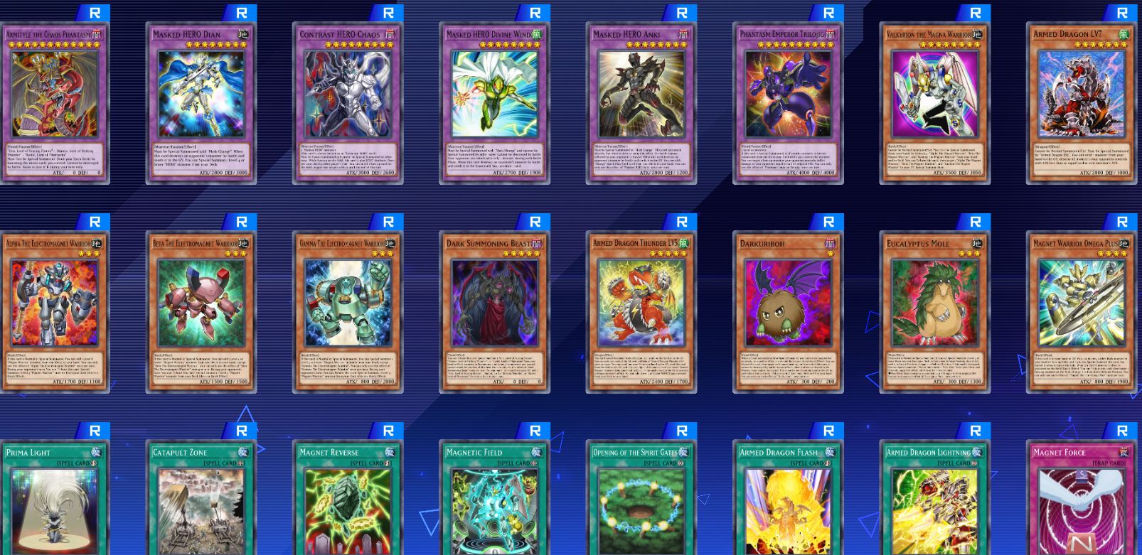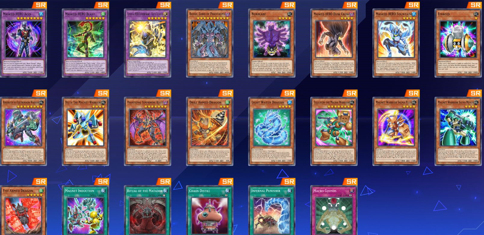 “”HERO”, transform! Go forth and fight for the justice you hold dear! “Masked HERO Atomic is the new ace of the “Masked HERO” archetype, while the “HERO” archetype also receives several other new cards! Multiple cards that strengthen “Magnet Warrior” Decks, such as “Conduction Warrior Plasma Magnum”, have also been added! Powerful cards such as “Matador Archfiend”, “Illusion Gate”, and “Dragonic Warrior” are also here to serve as reinforcements for “Archfiend Decks! Aim for even greater heights as you enjoy Dueling with these new cards!”