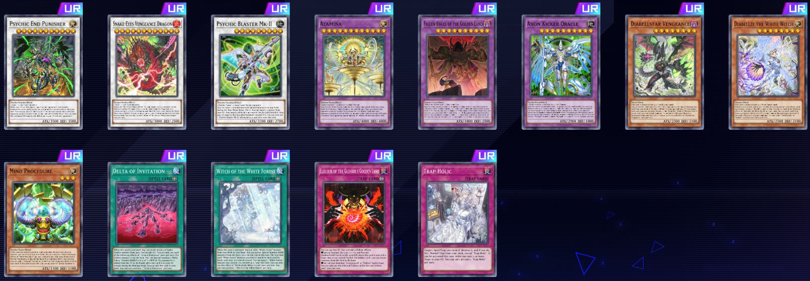 “With the weight of the world on its shoulders, this crimson dragon seeks to complete its journey of atonement! “Snake-Eyes Vengeance Dragon” also makes an appearance, as the story surrounding the “Sinful Spoils” archetype nears its exciting conclusion! Additionally, the Psychic ultimate weapon, “Psychic Blaster Mk-II”, is making its long-awaited return! Don’t forget to check out additional cards such as “Fallen Angel of the Golden Land” that serves the “Eldlich” archetype, and “Trap Holic”, which can enhance your Trap Card strategies! Use these new cards to devise strategies and seize victory!”
