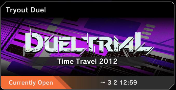 The Time Travel 2012 Tryout Duel is now live. By winning 3 matches, you can obtain 1 pack of the recent reprint set, Beyond the Next Level. The following Loaner Decks are available: