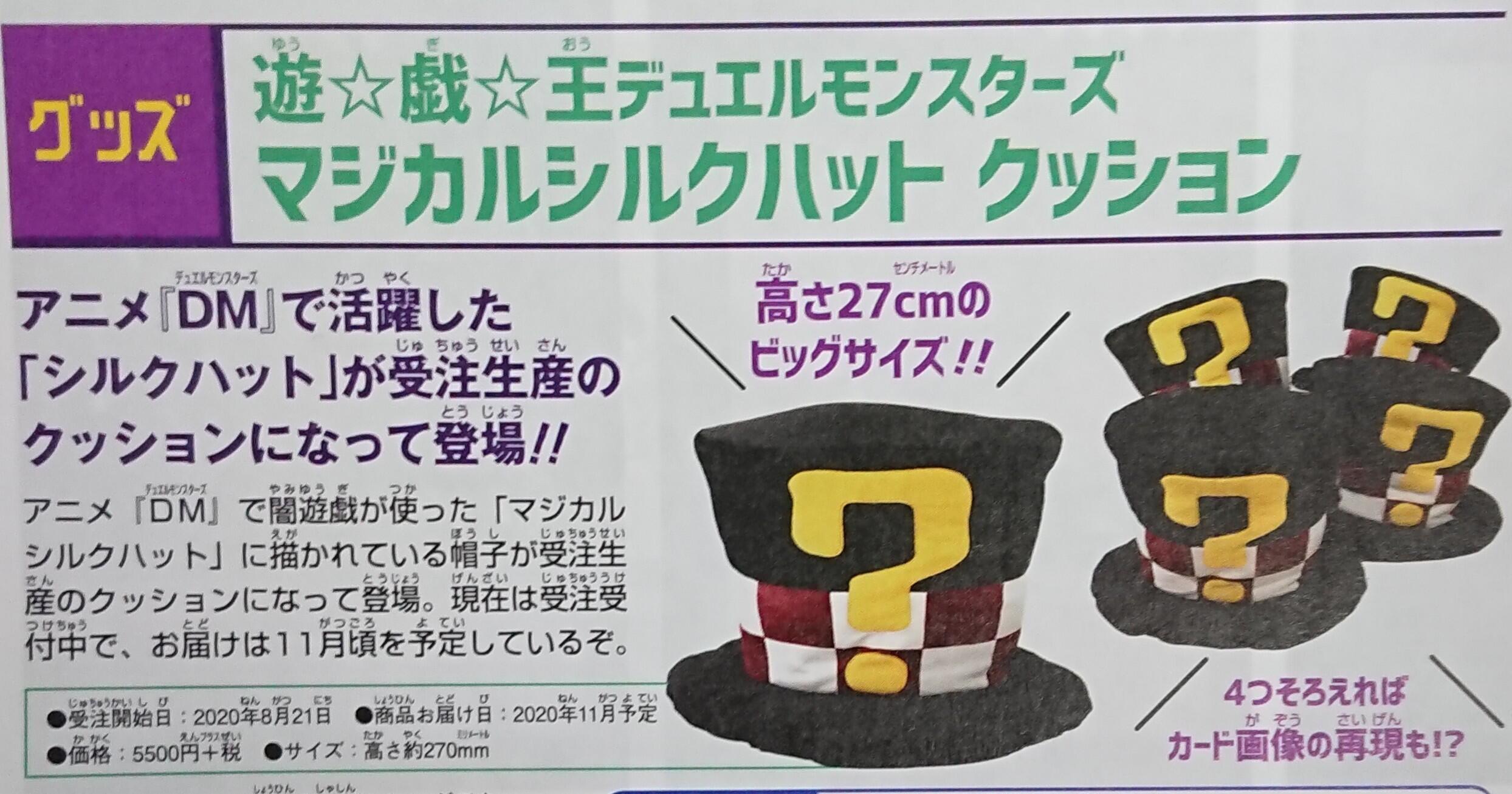 Join our Discord to discuss this article with fellow Duelists Become a Patron to support us for 12 years of all-volunteer work When you need to rest your head under the hat. Magical Hats Cushions will be sold as a limited time good. They can be ordered starting August 21st 2020 They will be delivered in November 2020 Price is 5500 Yen They’re 27 cm tall. Source: V Jump