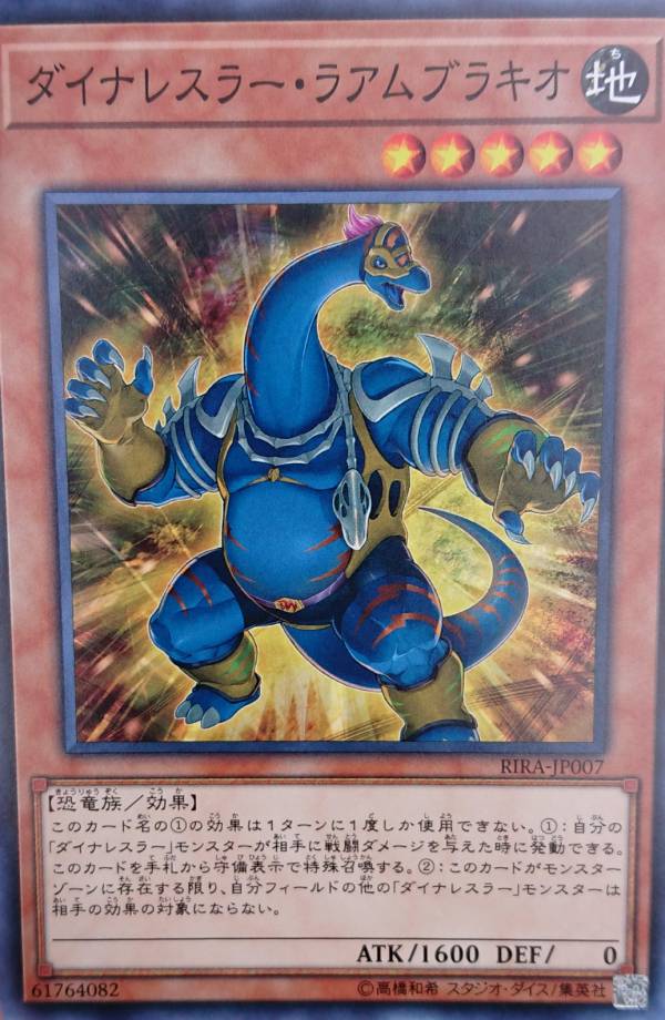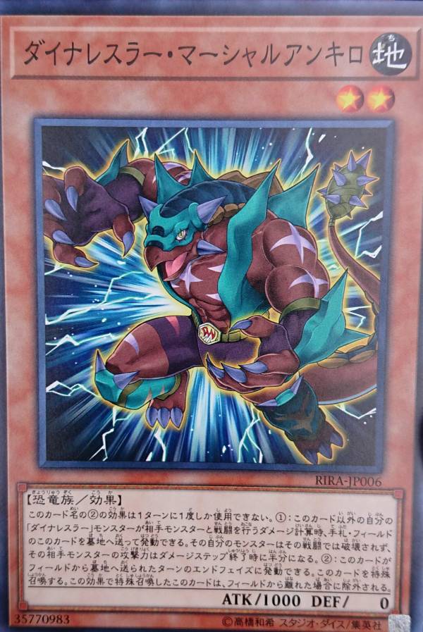 (1) If another “Dinowrestler” monster you control battles an opponent’s monster, during damage calculation: You can send this card that is in your hand or face-up on your field to the GY; your battling monster cannot be destroyed by that battle, also halve the ATK of your opponent’s battling monster until the end of the Damage Step.