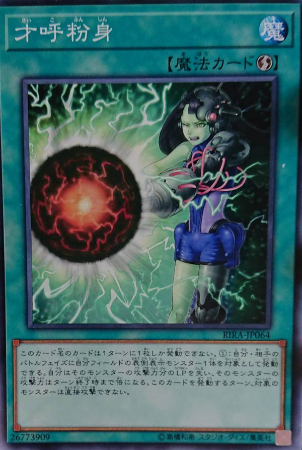 (1) During the Battle Phase: Target 1 face-up monster you control; you lose LP equal to that monster’s ATK, and if you do, double that monster’s ATK until the end of this turn. It cannot attack directly during the turn you activate this card.