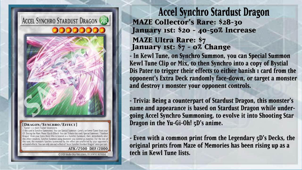 One tech that I’ve seen pop up in multiple lists has been Accel Synchro Stardust Dragon, as on its Synchro Summon, it can Special Summon 1 Level 2 or lower Tuner from your GY, which revives your Clip or Mix. Some have opted to run a copy of Stardust Dragon to Special Summon off of Accel’s effect to make Bystial Dis Pater, which can Summon back banished LIGHT or DARK monsters and help shuffle back your LIGHT/DARK monsters in order to destroy a monster that activated its effect or to shuffle back your opponent’s LIGHT/DARK monsters to negate that activated effect. The Extra Deck hasn’t been explored much, as there are plenty of other techs you can run; even the new Zaren the Chainbound Dragon (YGOrganization Translation) will be worthwhile in the Deck with it being a Level 7 DARK Dragon Synchro Tuner that requires 1 Tuner and 1 or more Synchro Monsters to access plenty of other Extra Deck monsters.