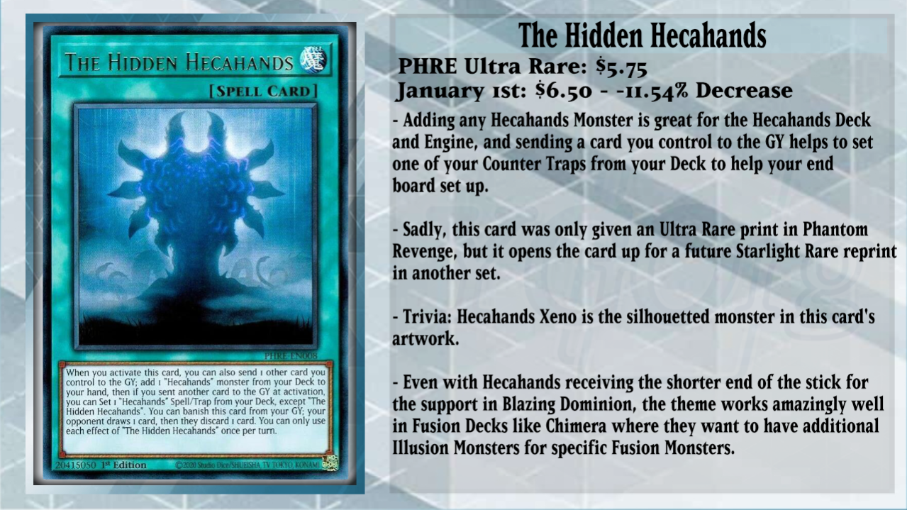 With the new support for all three Phantom Revenge themes, this week will be fully dedicated to the set itself to show how their new support affected the prices. With each theme receiving a grand total of 3 cards apiece, they have changed the Decks enough to become competent strategies for the future of the game. There will also be slight changes to the format of the article, so I hope you all enjoy it!