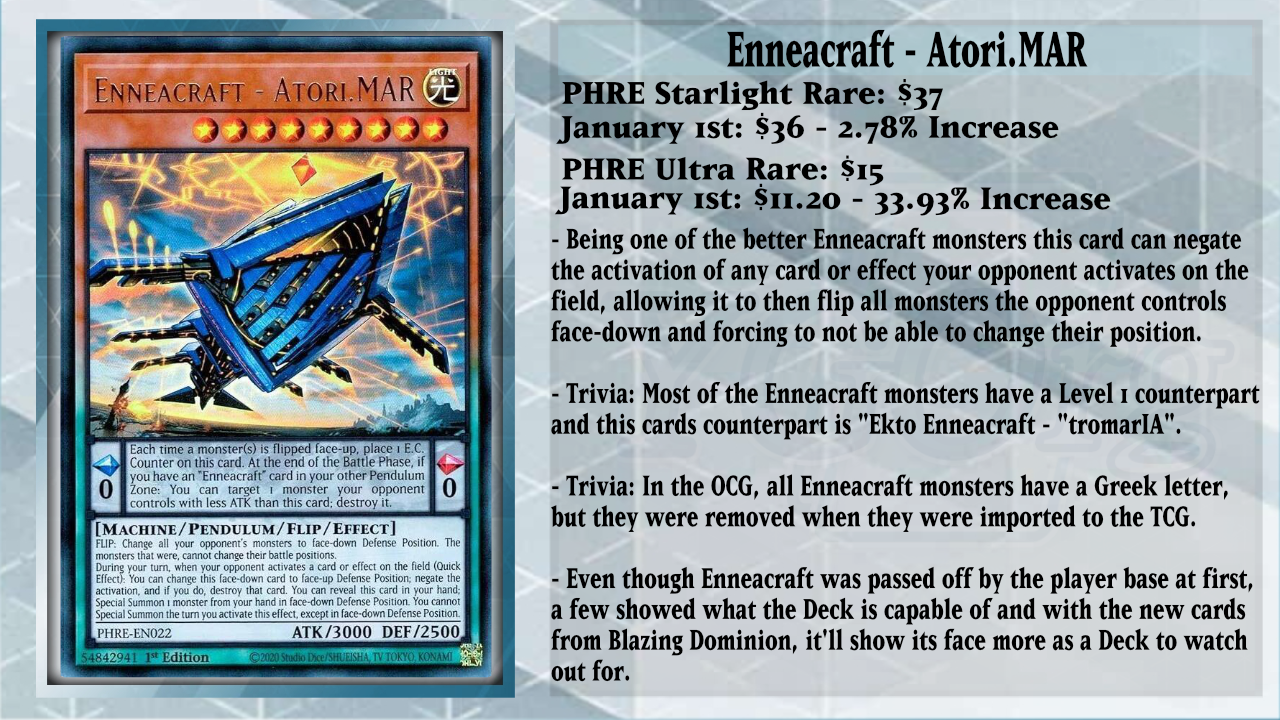 Our first stop will be looking at Enneacraft, as they don’t really have much to go over in terms of techs or cards to look for since they were given one Ultra Rare in the set, that being Enneacraft – Atori.MAR. The gimmick with Enneacraft is that all the Level 9s have the same Pendulum Effect that places 1 E.C. Counter on them, and at the end of the Battle Phase, if there is an Enneacraft card in the other Pendulum Zone, you can target and destroy 1 monster your opponent controls with less ATK than the Enneacraft card in the first Pendulum Zone. As for the monster effect, all share the effect that you can reveal them in your hand to Special Summon 1 monster from your hand in face-down Defense Position, but you cannot Special Summon face-up monsters the turn you use that effect. Atori is an interesting Boss Monster as when your opponent activates a card or effect on the field during your turn, you can quickly change this face-down Defense Position card to face-up Defense Position in order to negate that activation and destroy it. Then if this card was flipped face-up, you change all monsters your opponent controls to face-down Defense Position, and those monsters changed face-down by this effect cannot change their battle position. With their new cards, this Deck has even more ways to add any of their cards needed to your hand, and with Enneacraft – Atil.SPIA (YGOrganization Translation) turns the game into something less focused on Chain Links and more focused on one-for-one trading. So hopefully, you are ready for this post-Blazing Dominion.