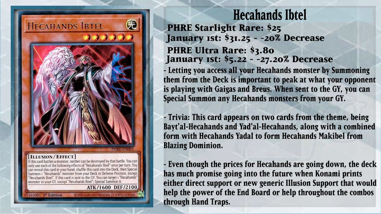 The starter Spell for Hecahands, The Hidden Hecahands, has shown its worth, as it can add any Hecahands monster from your Deck to your hand, depending on what you need. Special Summon a Hecahands monster from the Deck? Ibtel. Searching for a Hecahands Spell/Trap? Yadal. Excavate the top 3 cards of your opponent’s Deck and possibly Special Summon a monster from it? Gaigas. Look at 1 random card from your opponent’s hand and Special Summon it if it is a monster? Breus. Revive 1 monster from your opponent’s GY during their turn? Godos. It gives a wide variety of options for your turn, as you can also banish The Hidden Hecahands from your GY to make your opponent draw 1 card and then discard 1 card. This can trigger the in-hand effect of Breus, Gaigas, and Godos to Special Summon themselves to the field. Post-Blazing Dominion, you can add the new Hecahands Makibel (YGOrganization Translation), and this card can reveal itself in the hand to Fusion Summon 1 Hecahands Fusion Monster by using monsters from your hand or field, including Makibel. If an Illusion Fusion Monster is sent to the GY while Makibel is in the GY, you can add Makibel to your hand as a form of recovery so you can set up another Fusion play on the following turn.