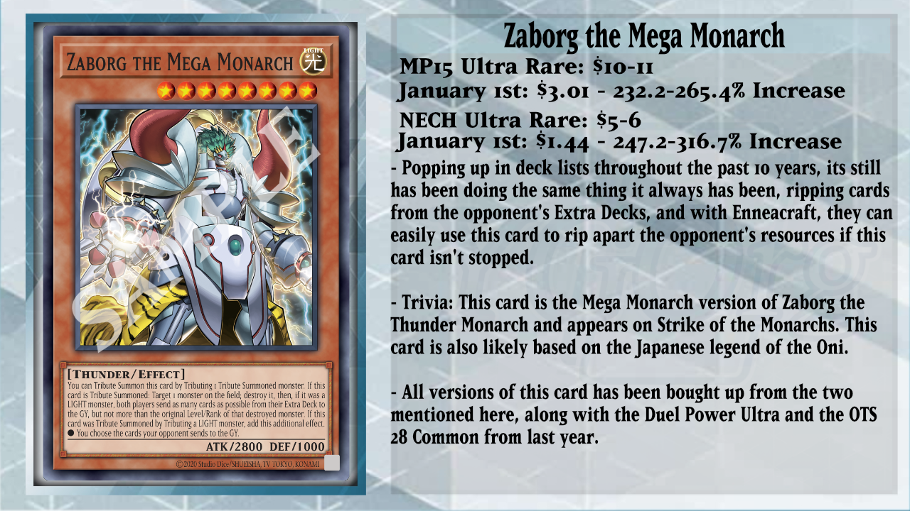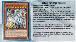 One of the few techs I wanted to talk about is Zaborg the Mega Monarch, as I’ve heard murmurs of players using this card in their Enneacraft Decks with the Level 9 monsters being LIGHT to synergize with that card’s effect. We have seen Mega Zaborg over the years from Nekroz to Dogmatika, but now, Enneacraft has taken use of it as if it is Tribute Summoned; you can target 1 monster on the field and destroy it. Then if it was a LIGHT monster, both players send as many cards as possible from their Extra Decks to the GY, but not more than the original Level/Rank of that destroyed monster. And if you Tributed a LIGHT monster to Tribute Summon Zaborg, you get to choose the cards your opponent sends to the GY. Being able to send up to 9 cards from the opponent’s Extra Deck is extremely powerful these days, as many themes rely on the Extra Deck to function.