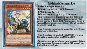 A new development has been made known where Radiant Typhoon Yummy as a Deck concept has worked extremely well as the new double-engine Deck like Mitsurugi Yummy before it. Some players have decided to run a heavier Tri-Brigade engine with a copy of everyone’s favorite silly lore character, Tri-Brigade Springans Kitt. This card is absolutely insane in the Deck as if you control a Springans or Tri-Brigade monster, you can Special Summon this card from your hand, and if it is sent to the GY, you can Special Summon a Tri-Brigade monster, Springans monster, a Fallen of Albaz, or a monster that mentions it from your GY. This is great when paired with any Tri-Brigade name like Nervall or Fraktall, as you can either search for it for a free extender or send it to revive any Tri-Brigade name for additional Link Material. The main use for this is to Link away the copy of Nervall to search for Fraktall, then use the Fraktall to send the copy of Tri-Brigade Springans Kitt from the Deck to revive the copy of Nervall from your GY. This sets up a Link-1 Monster, through Linkuriboh or Salamangreat Almiraj, and a Level 1 Monster with Tri-Brigade Nervall, so you can access any of the Yummy Synchro Monsters, especially Cupsy★Yummy Way. You can also banish the copy of Kitt and Fraktall, using Nervall’s effect, to Special Summon a copy of Ancient Warriors Oath – Double Dragon Lords for another form of interruption during the opponent’s turn.