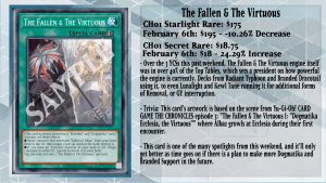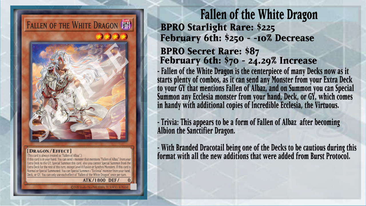 Being the star from Burst Protocol, Fallen of the White Dragon has been keeping a stable price since its release and after the 300th YCS. This card has changed many Decks as they are now all allowed to run a Branded Engine in some way without Branded Fusion itself thanks to this card and Ecclesia and the Dark Dragon. While this card is in your hand, you can reveal and send 1 monster that mentions Fallen of the Albaz from your Extra Deck to your GY to Special Summon Fallen of the White Dragon from your hand. Then on its Normal or Special Summon, you can Special Summon 1 Ecclesia monster from your hand, Deck, or GY to access a copy of Incredible Ecclesia or revive Ecclesia and the Dark Dragon from your GY after it was Synchro Summoned properly.