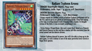 From the main Advanced YCS, Vanquish Soul K9 managed to win 2 of the 3 events from Guadalajara and Dortmund, respectively, while Radiant Typhoon Yummy Tri-Brigade won it at Richmond, causing VSK9 to lose a 3-for-3 win at the end of the 300th YCS events. With Radiant Typhoon receiving new support that made it into a top contender in the meta, players have been shown the strength of Radiant Typhoon Krosea, as it is one of the key monsters in the Deck. Krosea is an important card to the Radiant Typhoon strategy because if a Quick-Play Spell Card is activated, you can Special Summon Krosea from your hand after it resolves. It then would lead Krosea to be able to add any other Radiant Typhoon card, or a copy of Mystical Space Typhoon, from your Deck and/or GY to your hand when it is Normal or Special Summoned, but you are locked into Summoning WIND monsters for the rest of the turn. Either way, Radiant Typhoon has well over 18 total tops from this past weekend, cementing it into being a competent Deck to watch out for.