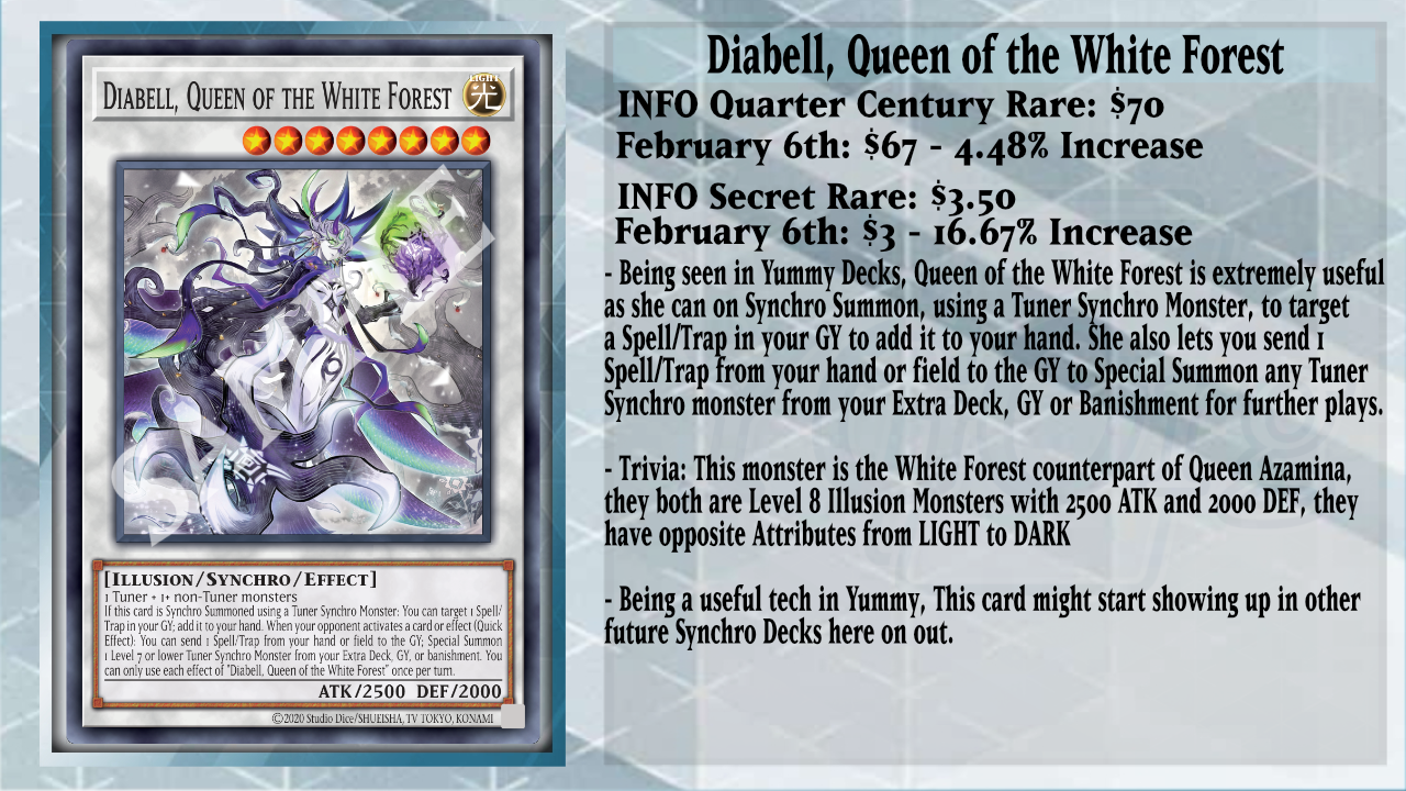 The first stop is Diabell, Queen of the White Forest, as it is the latest tech in Yummy Decks post the February Forbidden & Limited List update. She is extremely powerful in the Deck as if you use a Tuner Synchro Monster for this card’s Synchro Summon, you can target and add 1 Spell/Trap from your GY to your hand, which is extremely useful for recycling 1-of Floodgates or other cards like Yummy Surprise, Forbidden Droplet, or Piri Reis Map for follow-ups on your next turn. The other important effect from this card is when your opponent activates a card or effect, you can send 1 Spell/Trap from your hand or field to the GY to Special Summon from your Extra Deck, GY, or banishment any Level 7 or lower Synchro Tuner Monster. By using this card, you can access your Yummy Synchro Monsters from the GY to return them to the Extra Deck if your opponent activates a card or effect. You can also access Zalen the Shackled Dragon in order to use its effect in response to another card or effect activation to negate the first effect or the second effect in the Chain and destroy that card. Diabell even lets you access other cards for Off-Turn Synchro Summoning on the opponent’s turn.