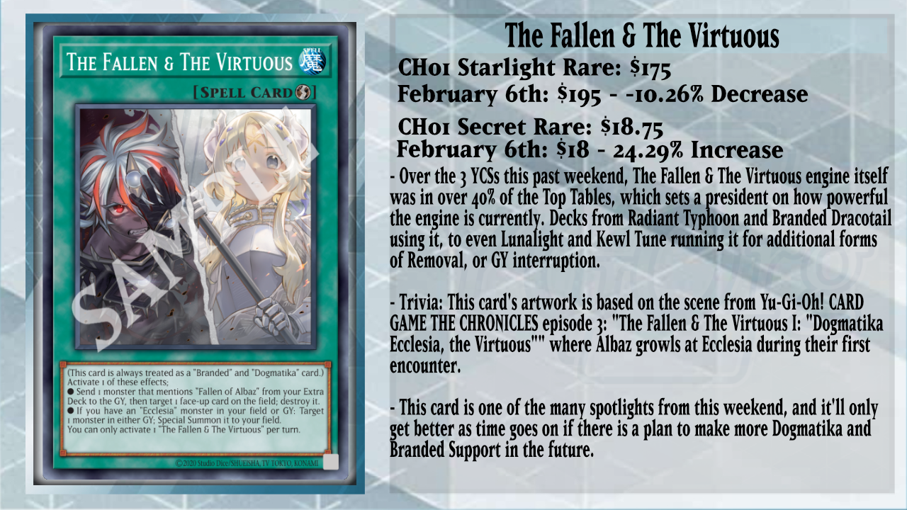 The card that dominated this weekend was The Fallen & The Virtuous from the self-titled CHRONICLES DECK: The Fallen & The Virtuous Structure Deck. This single card was all over the place in many Decks from Dracotail, Branded, and Radiant Typhoon to even Decks like Lunalight, Mitsurugi, Kewl Tune, and Elfnotes. This card has become a well-rounded staple in most Decks due to the release of Ecclesia and the Dark Dragon, giving you more cards to send from this card and being able to recycle Albion the Branded Dragon for another use. More thanks to Ecclesia and the Dark Dragon, as it can allow The Fallen & The Virtuous to be a form of GY disruption, as it can target and revive any monster from the GYs, which can be detrimental against many current Decks. This card has paved the way into the new format as one of the go-to techs for many players to combat Dracotail Flame and other targeting-like effects that would prevent other effects from taking place.