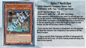 Maliss is still in it… to win it? It saw multiple tops this weekend, with a total of 13 players on the strategy that made Top 64 from Richmond and Dortmund and the Top 32 from Guadalajara. Maliss P March Hare has been rising in price due to no reprint in sight, but also with how well Maliss has been performing over the past week. With the recent banning of Maliss Q White Binder, it put a damper on the grind game of being able to reset the Maliss Trap Cards from your GY, banishing up to 3 cards from the GY(s), and drawing you 1 card when Special Summoned back from being banished at the cost of 900 LP. Players have figured that the ban was only a flesh wound to the Deck, where Maliss P Dormouse is still Limited and Maliss in Underground is still Semi-Limited, letting the Deck access follow-up plays for the next turn. It’s been interesting watching the Deck develop over the past year, as it is completely different from what it was well over 6 months ago, from near full power to the monster it has become today. Players like Shunping Xu managed to take it all at a Regional recently, going 9-0 at New Haven, Connecticut, and focusing on cards like Allure of Darkness for additional consistency, Transcode Talker for faster ways to OTK and help assist the final board for the opponent’s turn, Dimensional Prison in the Side Deck for Branded Dracotail, and even both a copy of Rivalry of Warlords and Gozen Match for many of the current Decks wanting to use multiple Types and Attributes. Still being at 3, March Hare still brings a lot into the Maliss Deck as it can banish any of your Maliss names from your hand or GY to Special Summon itself from the hand, and when it is banished itself, you can target 1 Maliss monster that is banished, including itself, to add it back to your hand. This can help trigger many of your Maliss names when they are banished to Special Summon themselves for ways to proceed in any combo route.