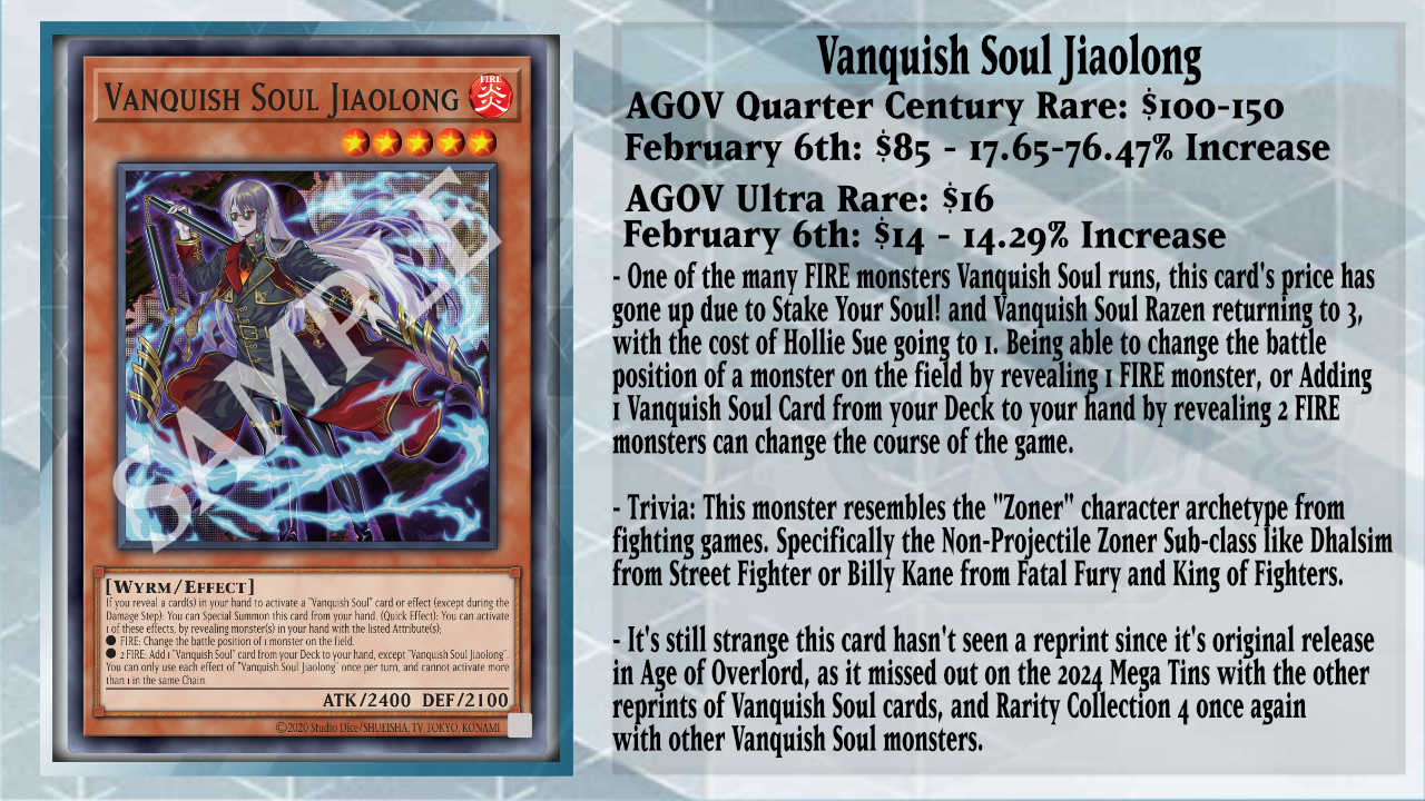 It isn’t a Market Watch article without the mention of Vanquish Soul once again. And in the spotlight is Vanquish Soul Jiaolong, as it has been some time since the last mention. The Limitation of VS Hollie Sue hurt the amount of the Level 5s the Deck ran, but with Stake Your Soul! and VS Razen returning back to 3 copies per Deck, the number of ways to get to the card and the amount of FIRE Attribute monsters have gone up! This is because VS Jiaolong relies on how many FIRE monsters are in your hand, so you can either reveal 1 FIRE monster to change the battle position of 1 monster on the field or reveal 2 FIRE monsters to add any VS card from your Deck to your hand, which is absolutely amazing for searching up a copy of VS Hollie Sue if needed. The great thing about Jiaolong is that if you reveal a card(s) in your hand to activate a VS card or effect, you can Special Summon Jiaolong from your hand, which grants you an additional Level 5 or a free Link Material on your field.