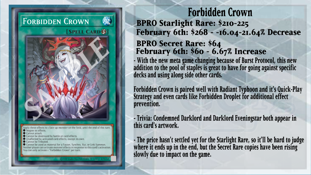 Finally, we will be looking at the newest Forbidden card in the series, Forbidden Crown. This card was hyped extremely well at its reveal, and many thought it would be a staple for every Deck to use. But knowing how things always go, it gets printed as a Secret Rare that is slightly difficult to pull out of a pool of 10 Secret Rares. But the odd thing about it is that only 6 known lists, as of writing this article, were running the card as either a Main Deck tech or running it in the Side Deck for specific matchups. It’s a very interesting and polarizing card in the metagame, as Crown prevents the monster you apply the effects to from having its effects negated, cannot attack, cannot be destroyed by battle or card effect, is unaffected by activated card effects (except its own), and cannot be Tributed or used as a material for a Fusion Synchro, Xyz, or Link Summon. All this makes it fantastic against Decks like Yummy if used on Yummy★Snatchy.