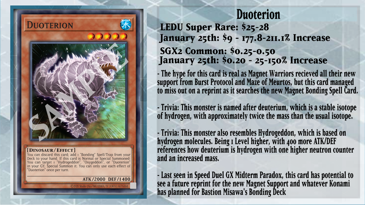 Surprisingly, Duoterion, a card massively hyped from the OCG Burst Protocol Stream for the new Magnet Warrior support, missed out on a reprint, which is extremely odd. This card can be discarded from your hand to add 1 Bonding Spell/Trap Card from your Deck to your hand. This is extremely useful, as Magnet Bonding can either add a Conduction Warrior Linear Magnum Plus Minus or a Level 4 or lower Magnet Warrior monster from your Deck to your hand, a Level 8 Magnet Warrior from your Deck to your hand, or Fusion Summon 1 Rock Fusion monster by shuffling Rock monsters from your hand, field, GY, and/or banishment into the Deck. This last part is useful for Summoning either Conduction Warrior Plasma Magnum or the new World Premiere card Flux Ochsenfeld.