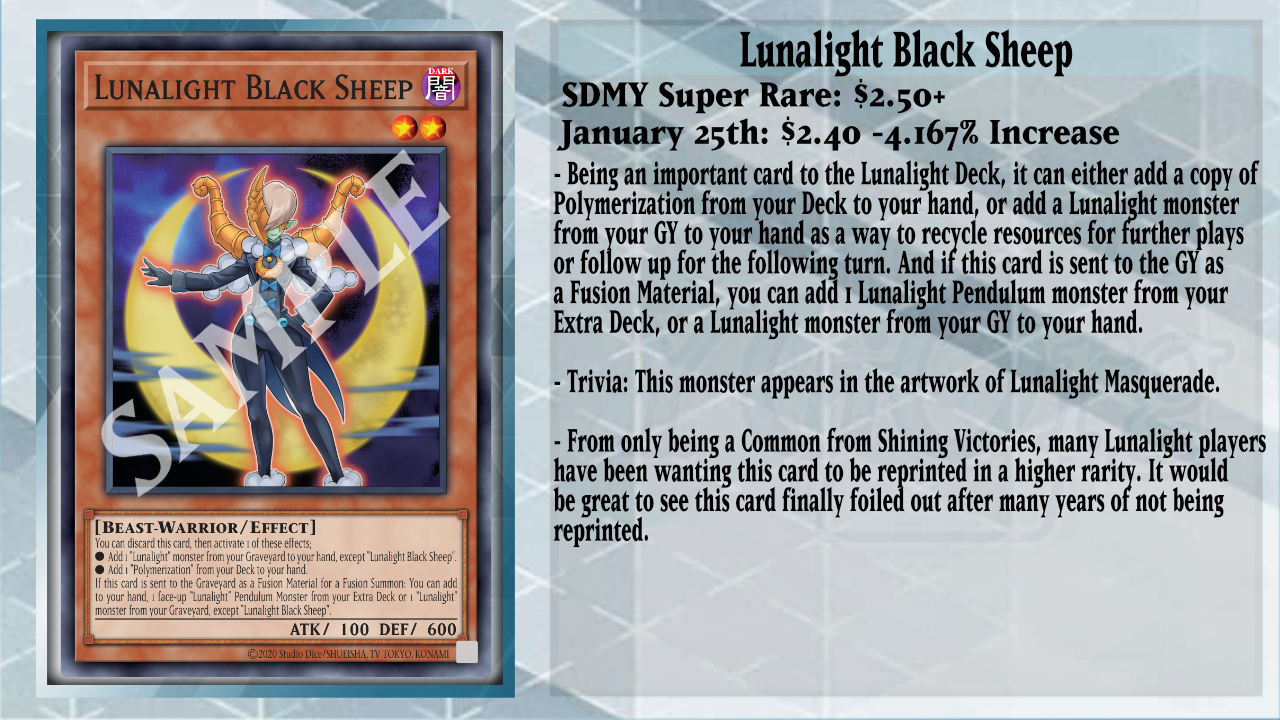For the cards that still would be great to see reprints for, I think this one definitely deserves the spotlight, that being Lunalight Black Sheep, from Shining Victories. This card is an important card for Lunalight, as it can add either a Polymerization from your Deck to your hand or a Lunalight monster from your GY to your hand, which can help trigger Lunalight Gold Leo. If a Lunalight monster is sent to your GY while Leo is in the Monster Zone, you can target 1 of them and add it back to your hand, which lets you recycle that Black Sheep. Another use for Black Sheep is if it is sent to the GY for a Fusion Summon, you can add 1 face-up Lunalight Pendulum Monster from your Extra Deck, or a Lunalight monster from your GY, to your hand, which is extremely useful for recoverability and the potential to set up more resources for your combo, or for a follow-up on your next turn. Hopefully, this card sees a new reprint this year; as soon as it does, it’ll be moving onto 10 years without a print for a vital piece of the Lunalight Deck.