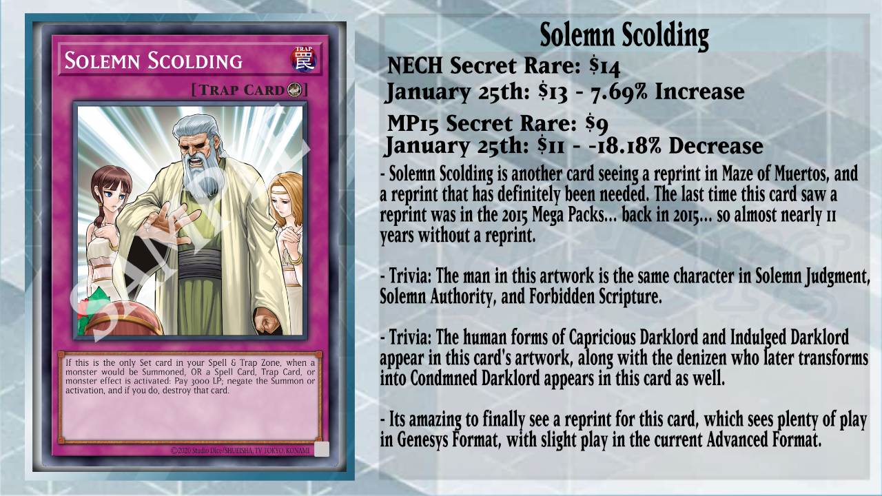 For the Genesys players, Solemn Scolding has a new rarity that isn’t Secret Rare, being now Ultra Rare instead. Previously, we talked about this card as it was unpointed for a bit at the start, and it’s a big power push to try and stop the opponent from breaking your board fully. While Scolding is the only Set card in your Spell/Trap Zones, by paying 3000 LP, you can negate the Summon of a monster(s) or the activation of a Spell/Trap Card or monster effect, and if you do, destroy that card. Scolding being a powerful push for decks that have multiple other pieces of interruptions in addition to this could stop nearly everything if timed or used correctly. It’s great that this card finally received another reprint to make it accessible to the players, especially after almost 11 years.