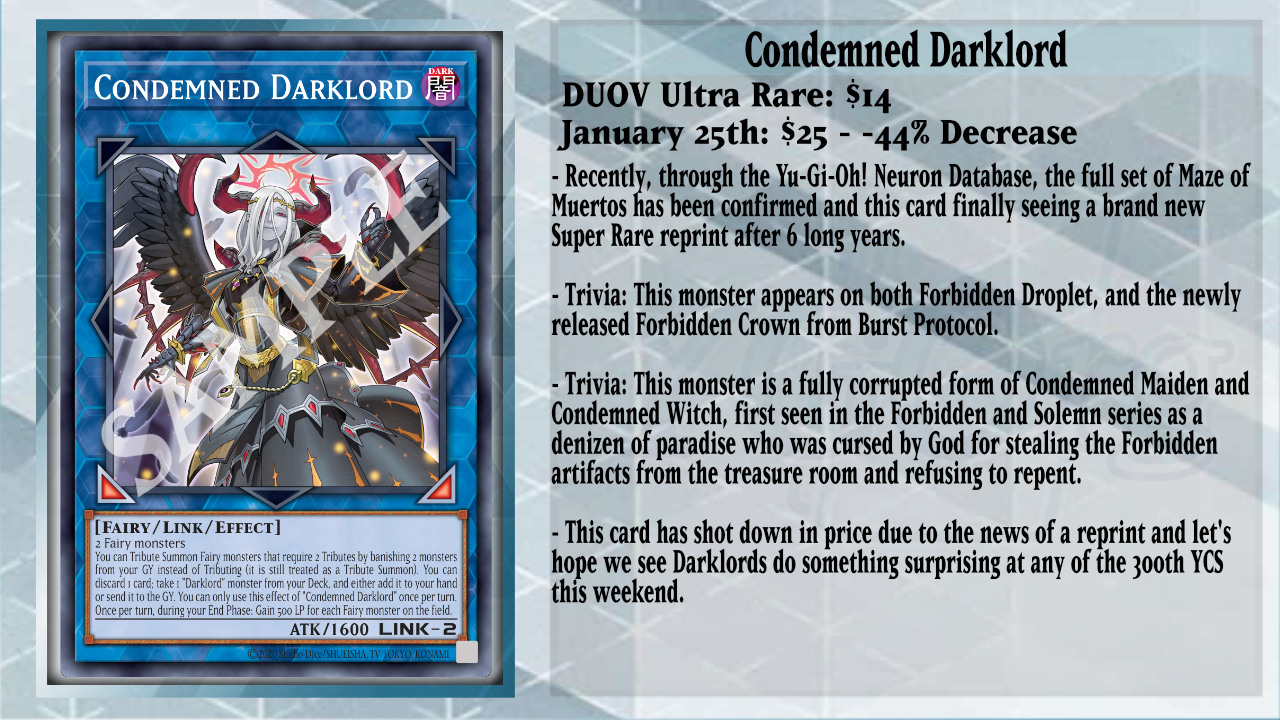 After almost 6 long years, Condemned Darklord has received a Super Rare reprint from its original Ultra Rare print from Duel Overload. This card has become one of the most prominent Link Monsters in Fairy Decks over the years, and for the new Darklord support, it is extremely needed for many purposes. Condemned lets you Tribute Summon Fairy monsters that require 2 Tributes by banishing 2 monsters from your GY instead, which has plenty of potential with Archlord Kristya or Darklord Morningstar. Other things Condemned can do are that you can discard 1 card to either add to your hand or send from your Deck to the GY, 1 Darklord monster from your Deck, and during your End Phase, you gain 500 LP for each Fairy monster on the field, which can add up quickly if you have more Fairies than itself. I am grateful that this card finally received a reprint, as it was nearing up to $30 a copy due to the hype of Gem-Knight Darklord and other Darklord-related Decks.