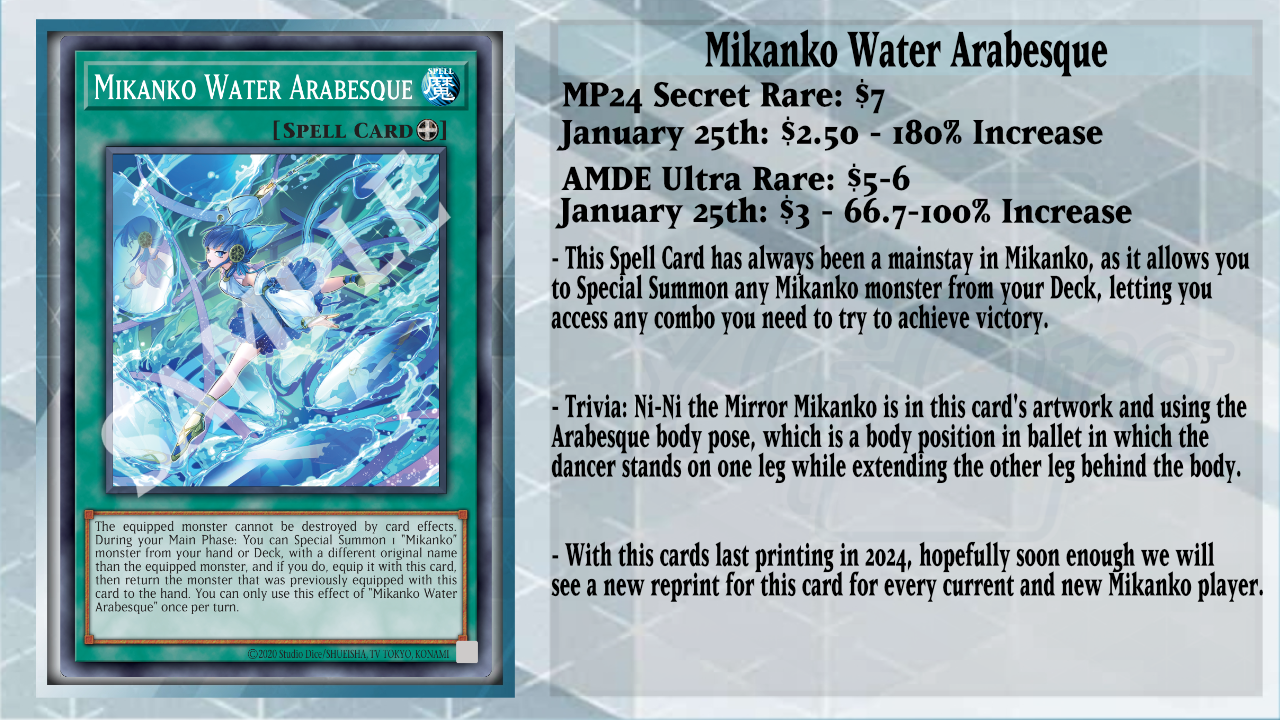 Finally, because of the new Mikanko support arriving to the TCG, Mikanko Water Arabesque has been going up in price, while quantities are going down, as players pick up cards needed for the deck. While you have this Equip Spell face-up on your field, you can Special Summon 1 Mikanko monster from your hand or Deck with a different original name than the equipped monster. This is useful, as if you’re using a going-second build, whatever you equip it to won’t share a name with a Mikanko monster. Then this card equips to the monster you Summoned from the Deck and returns the other monster that was equipped with this card to the hand. Being one of the best Equip Spells for Mikanko, I can see this card going up more in price than it already has, and it’ll be interesting to see where this card will be reprinted in the future.