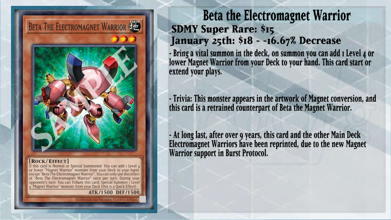 With new Magnet Warrior support in Burst Protocol, many of the older cards from Structure Deck: Yugi Muto, which have one print, were hit up from Gamma and Alpha the Electromagnet Warrior, but the best one is Beta the Electromagnet Warrior, which happens to be around $25 a copy. This is because when it is Normal or Special Summoned, Beta can search for a Level 4 or lower Magnet Warrior monster, which is great with the new support for plenty of their combos, and during the opponent’s turn, you can quickly Tribute Beta to Special Summon 1 Level 4 or lower Magnet Warrior from your Deck, but most of the time, you will use it to Synchro Summon Naturia Beast with Adamancipator Researcher.
