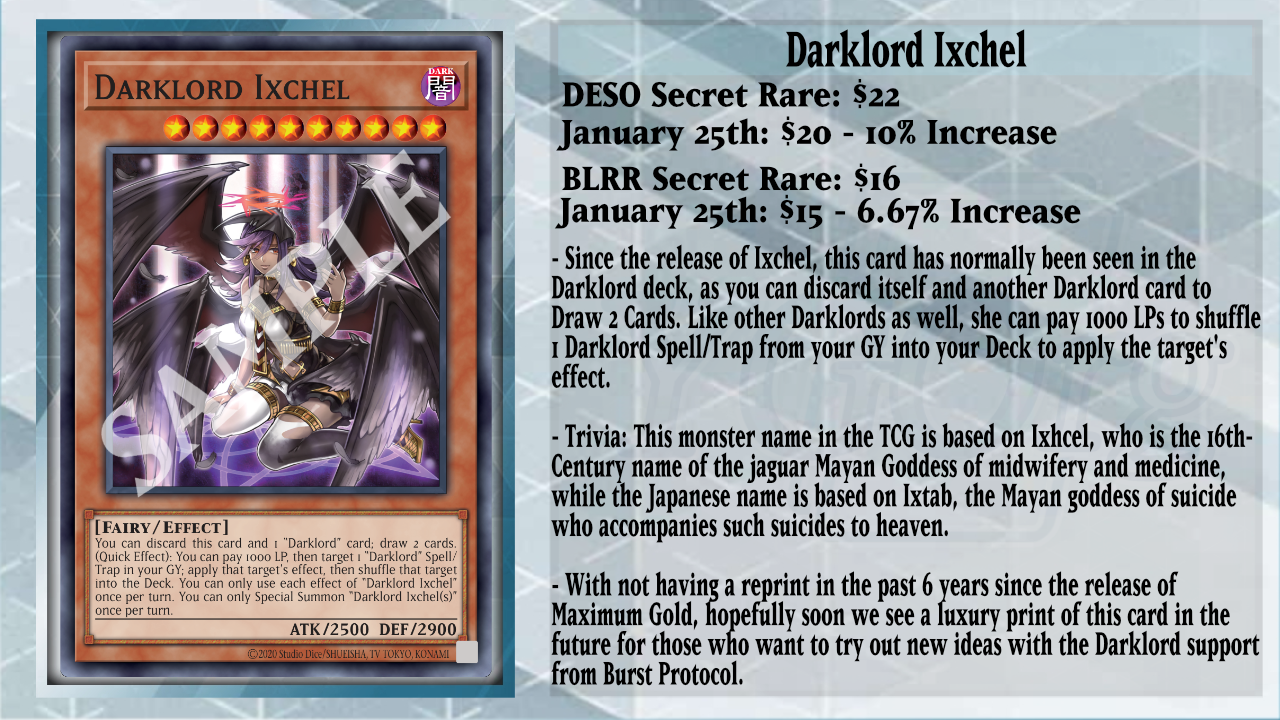 I’ve seen plenty of talk about Darklord Ixchel, and it was missed on a new reprint as the last time we saw this card printed was a Gold Rare in Gold Series: Maximum Gold from 2020. Ixchel has always been a card that Darklords ran because of its draw effect, which goes off by discarding Ixchel itself and another Darklord card. This lets you dig into the Deck for Banishment of the Darklords, Darklord Contact, or even put your Darklord Trap Cards in the GY so you can pay 1000 LP to shuffle and copy their effects via the main Destiny Soldiers monsters. But with the new Burst Protocol support, who knows how many copies the Deck will run in the future, as I’ve seen anywhere from 1 to 2 copies at least, while some exclude the card to have other cards fill the gap of not running it.