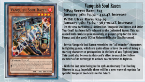 Along with K9 receiving Limits, Vanquish Soul Hollie Sue was also recently Limited for the Vanquish Soul K9 strategy, but there was a trade-off by allowing both Stake Your Soul! and Vanquish Soul Razen to go back to 3. This is a huge boost to the Vanquish Soul Deck itself, as it gained 2 of its best starters back to full power, whereas Hollie Sue was used sometimes when Razen was Limited for the past few months. With the addition of 2 more copies of Razen to your list, you can now Normal/Special Summon it to search for any of your non-Warrior Vanquish Soul monsters more reliably and have additional FIRE monsters in your Deck, so the Rescue-ACE engine is needed less now. By revealing a FIRE monster, Razen cannot be destroyed by card effects this turn, but the better effect is when you reveal a FIRE and DARK monster to destroy all other monsters in Razen’s column, which is a great piece of removal for the Deck. Seeing both Vanquish Soul and K9 receive changes on the list really curved the Deck in a way that you rely on the VS cards more in your list, to where the K9 cards add additional coverage where VS misses out on.