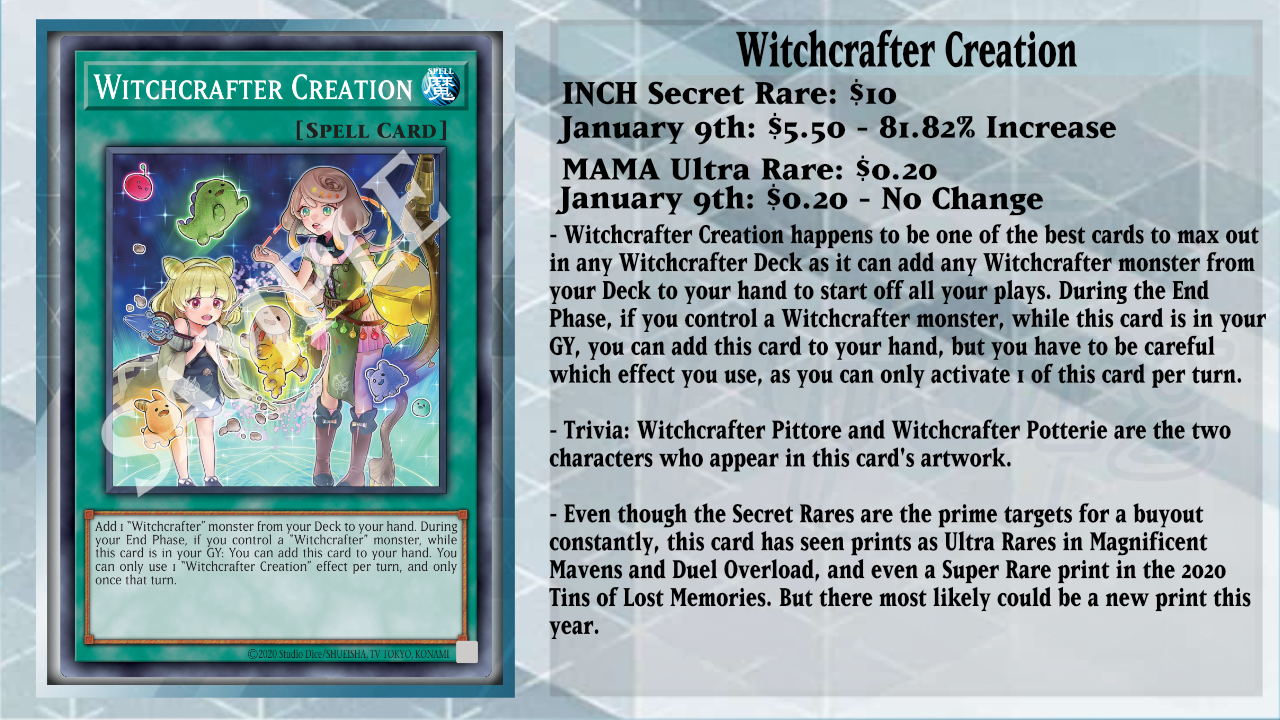 Finally, we have Witchcrafter Creation, and this is a searcher card like Toon Table of Contents, but not as absurd, as it can only search for any Witchcrafter monster from your Deck to your hand, letting you access any of your low-Level Witchcrafter monsters. All the lower-Level monsters let you quickly discard 1 Spell to Special Summon 1 Witchcrafter monster from your Deck as a recruitment-style effect. If you Special Summon Witchcrafter Haine, she can protect your other Spellcasters from being targeted, and you can quickly discard 1 Spell to target and destroy 1 face-up card your opponent controls. Adding Witchcrafter Golem Aruru with Creation isn’t a bad idea either, as when your opponent activates a card or effect that targets a Spellcaster(s) you control or targets one for an attack too, you can quickly target 1 card your opponent controls or a Witchcrafter Spell in the GY to Special Summon Golem Aruru from your hand and return the targeted card to the hand. However, during the opponent’s Standby Phase, Golem Aruru is returned to your hand.