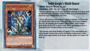 Along with Radiant Typhoon Krosea, Noble Knight’s Shield-Bearer has finally caught on in the market for players of the Deck as another starter. This card from Brothers of Legend has massive potential since you can banish it from your hand or field to add any Level 6 or lower WIND Beast monster from your Deck to your hand, which is perfect for adding the copy of Radiant Typhoon Eldam to start your plays. This ties into the Deck perfectly, as getting to Eldam lets you add any other Radiant Typhoon monster, or 1 Mystical Space Typhoon, from your Deck to your hand, and the best two to search for are Radiant Typhoon Swen or Krosea itself. The upside to Eldam is if you have a Mystical Space Typhoon, or your opponent controls no Spell/Traps, you can Special Summon Eldam from your hand, which can be useful if you used your Normal Summon for Shield-Bearer, but also great as you can lead with this card so you don’t have to use your Normal Summon immediately.
