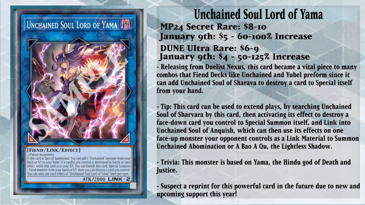 On the block for the Unchained side of the set, Unchained Soul Lord of Yama has seen a recent spike due to the announcement, as this powerful Link-2 monster from Duelist Nexus has become a huge focal point for any Fiend strategy. On its Special Summon, this card can add any Unchained monster from your Deck or GY to the hand, letting you access Unchained Twins – Aruha or Unchained Soul of Sharvara for extending your plays. If a card(s) you control is destroyed by battle or card effect while Yama is in your GY, you can banish Yama to Special Summon any Fiend from your hand or GY, and then you can destroy 1 card you control. This means you can destroy any of your Unchained Spells or Traps to Special Summon 1 Unchained monster from your Deck.
