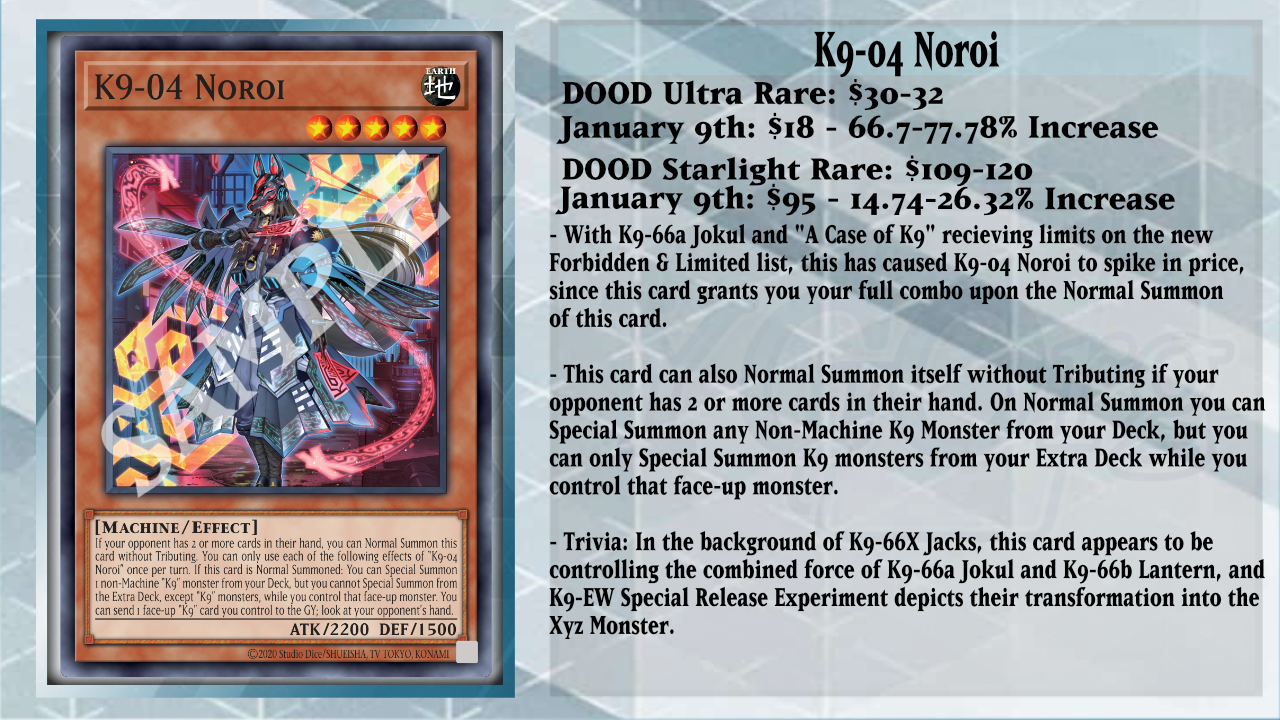 On the new Forbidden & Limited list, we saw both K9-66a Jokul and “A Case for K9” receiving a Limitation in the format; this has caused K9-04 Noroi to rise in price as a way to replace copies of what was lost from both cards. It is another card from Doom of Dimension that has been rising up in price, and for good reasons, as if it is Normal Summoned, Noroi can Special Summon 1 non-Machine K9 monster from your Deck, but you cannot Special Summon monsters from the Extra Deck, except K9 monsters, which is fine as you will overlay what you Summon into K9-17 “Ripper”, then search for any K9 card from your Deck to your hand by detaching 1 material. With Noroi, it has an additional bonus that you can send 1 card you control to look at your opponent’s hand, see what the opponent is on, and see what other interactions they have for your turn. Also, if your opponent has 2 or more cards in their hand, you can Normal Summon Noroi without Tributing so you can fulfill more going first.