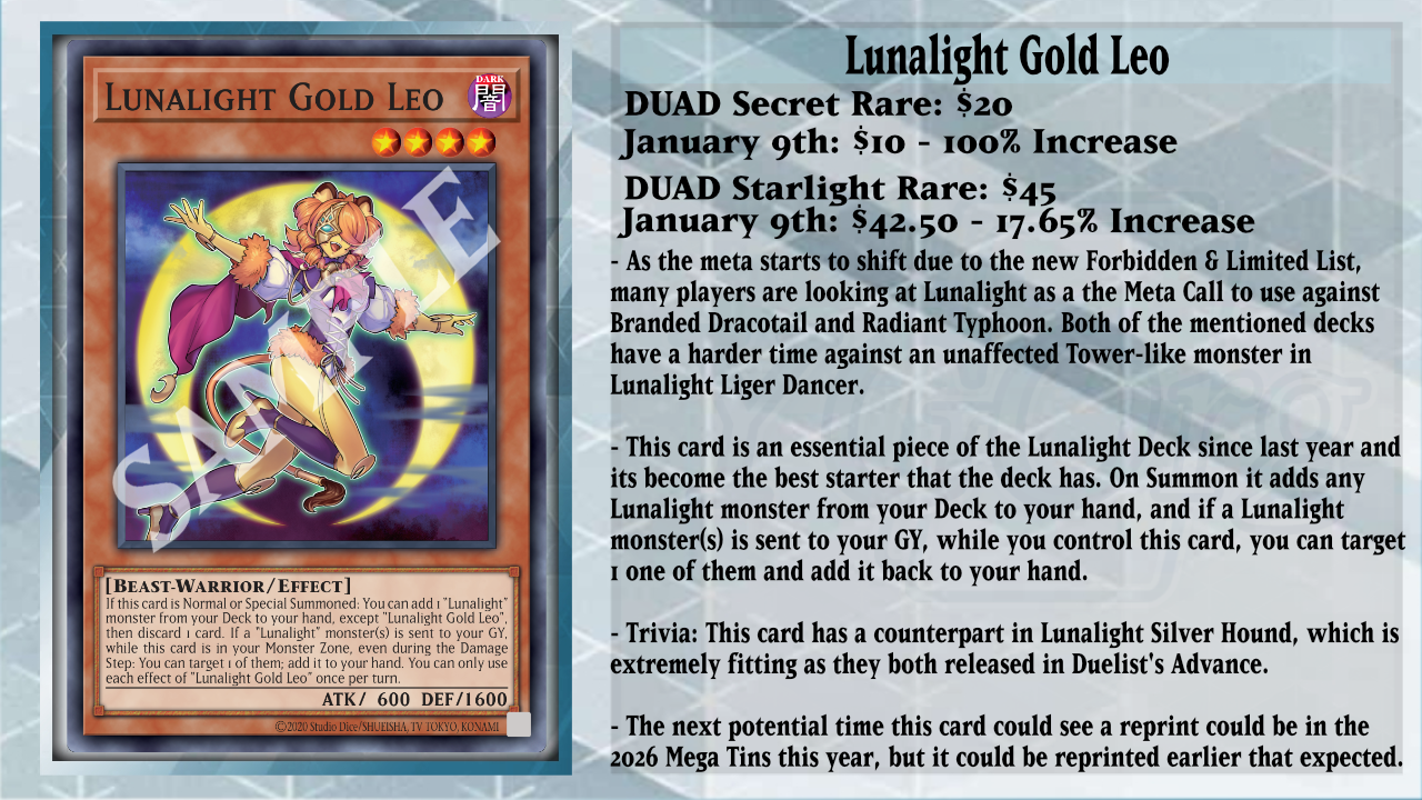 Next up is a powerful contender for the next format, and that is Lunalight. Being a great Deck that can compete against both Radiant Typhoon and Branded Dracotail, this could be the meta call going into the YCS 300 events. With this happening, Lunalight Gold Leo has spiked up in price, going over double its price at the start of the month as one of the main monsters in the strategy. If Gold Leo is Normal or Special Summoned, you can add 1 other Lunalight monster from your Deck to the hand, then you discard 1 card afterwards, which is great for discarding cards like Lunalight Silver Hound or Yellow Marten, which will trigger their effects to search for more Lunalight cards. The upside to this discard is if a Lunalight monster(s) is sent to your GY while Gold Leo is in the Monster Zone, you can target 1 of them and add it back to your hand, which is great for recycling cards like Lunalight Black Sheep or a sent Lunalight Kaleido Chick.