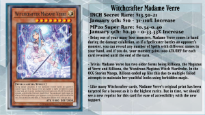 There isn’t much to talk about currently for Unchained, as a majority of their cards are cheap, so we will take a look at the duo that always gets bought out from Witchcrafter. So welcome in Witchcrafter Madame Verre, a boss monster of the Witchcrafter Deck, as during damage calculation, if your Spellcaster monster battles an opponent’s monster, you can reveal any number of Spells with different names in your hand to make that Spellcaster monster gain 1000 ATK/DEF per each card revealed. This can swing the game in your favor if the opponent is only expecting you to reveal 1 card, as revealing more than 2 can cause issues. This is because you can quickly discard 1 Spell to negate the effects of all face-up monsters your opponent currently controls until the end of that turn. Having a way to blanket negate the opponent is another worry the opponent has to deal with on top of that ATK/DEF gain effect.