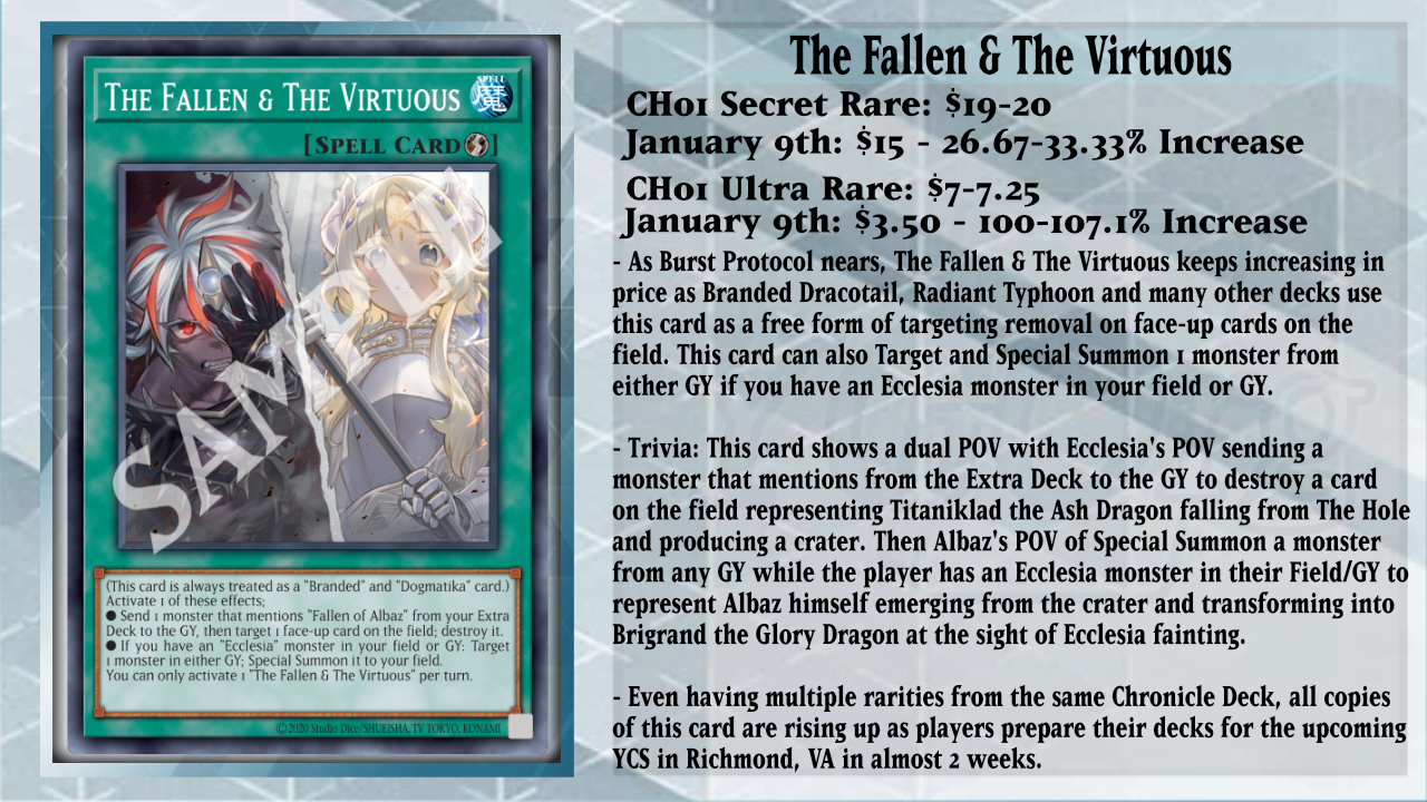 A staple you will find in most lists in the future will be The Fallen & The Virtuous Spell Card from the self-named Chronicle Deck, The Fallen & The Virtuous. This card is going up for numerous reasons, and now with Burst Protocol finally releasing in the TCG soon, it has been making moves on the market for all three versions. This card has been impactful for many Decks from Dracotail to Sky Striker. And now? It is about to be more insane with the additions of Ecclesia and the Dark Dragon and Fallen of the White Dragon. It has been proven time and time again that this card has the power, and it’s waiting to be unleashed because of the two effects it houses. Being always treated as both a Branded and Dogmatika card is a good start, since it makes it heavily searchable/settable from Albion the Branded Dragon, and when you activate this card, you can use 1 of its effects. Firstly, you can send 1 monster that mentions Fallen of Albaz from your Extra Deck to the GY to target 1 face-up card on the field and destroy it. Secondly, if you have an Ecclesia monster in your field/GY, you can target and Special Summon 1 monster from either GY. This makes both sides of this card have powerful interruptions. You can send Albion the Branded Dragon to the GY to Set any Branded Spell/Trap Card from the Deck to the field or set up Rindbrumm the Striking Dragon to target a copy of Fallen of Albaz in the GY to Special Summon either Albaz or Rindbrumm and banish the other. Having another forced interruption can come in handy in order to Fusion Summon Mirrorjade the Iceblade Dragon. But if you send Ecclesia and the Dark Dragon, you can target 1 Level 8 Fusion Monster in your GY/banishment along with 1 card on the field and shuffle both cards back into the Deck for, again, another piece of removal.