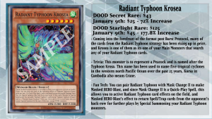 With Radiant Typhoon receiving new support to make it a contender in the Meta, players have been picking up their copies of Radiant Typhoon Krosea as it is one of the key monsters in the Deck. With well over 1700 sales in the past 3 months on TCGplayer, it is no doubt that players are ready for YCS Richmond, which is happening from February 13th to 15th. Krosea is an important card to the Radiant Typhoon strategy because if a Quick-Play Spell Card is activated, you can Special Summon Krosea from your hand after it resolves. And if Krosea is Normal or Special Summoned, you can add any other Radiant Typhoon card, or 1 Mystical Space Typhoon, from your Deck and/or GY to your hand, but you are locked into WIND monsters for the rest of the turn. Being one of your many play starters or extenders, nearly every list I’ve looked at has it as a 3-of because of how much power this card has behind it.