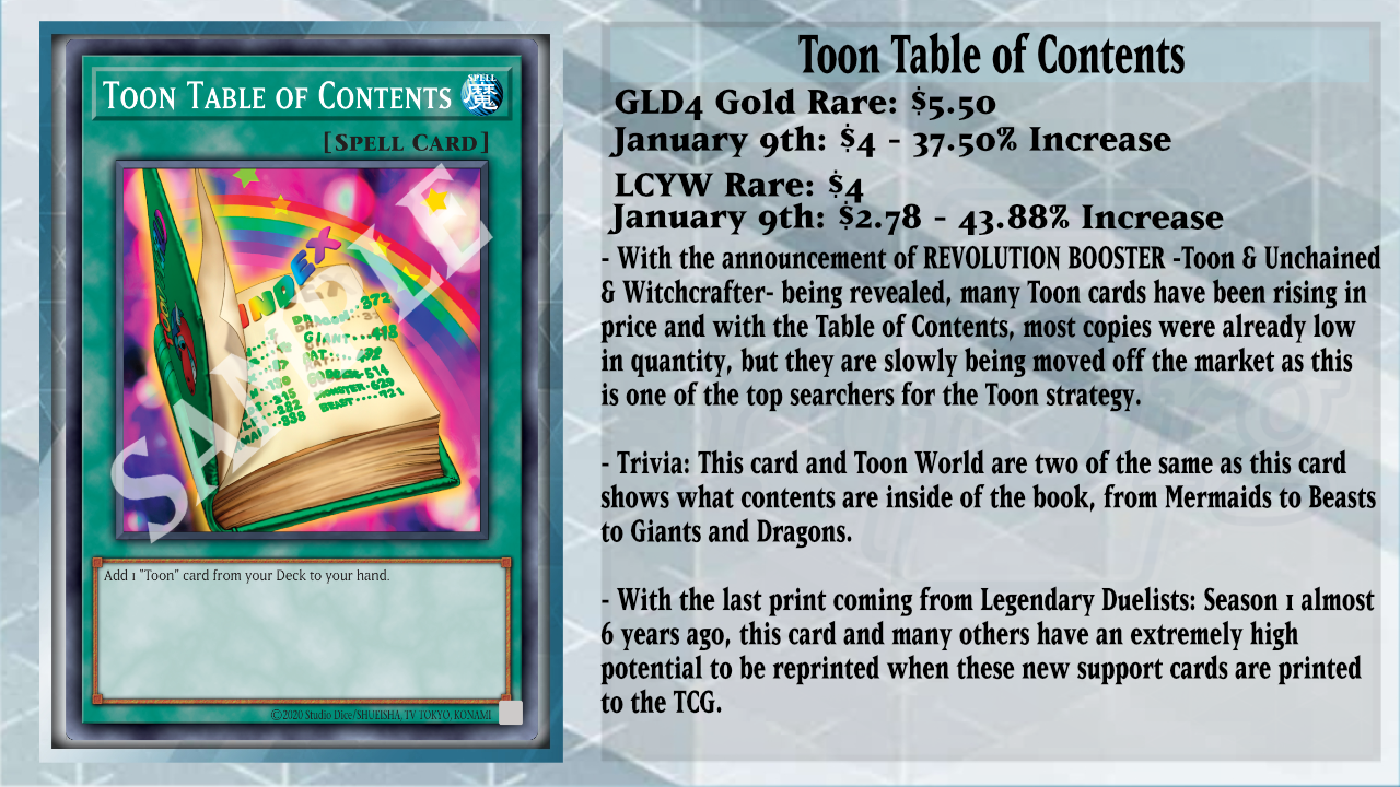 Over the past few days, the OCG has revealed a new Revolution Booster set that will be giving support to three iconic themes: Toons, Unchained, and Witchcrafters, and due to this announcement, plenty of cards spiked. So let’s take a look at what has happened. The first stop is Toon Dark Magician, which, on the North American market, has less than 65 listings total over its 5 printings between TCG and Speed Duel, and it is slowly being cleared off the market. Being one of the vital cards of the Deck, this card lets you discard 1 Toon card to either Special Summon 1 other Toon monster from your Deck, ignoring its Summoning conditions, or add 1 Toon Spell/Trap from your Deck to your hand, like Toon Table of Contents, Toon Bookmark, or even Toon Kingdom.