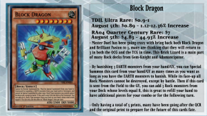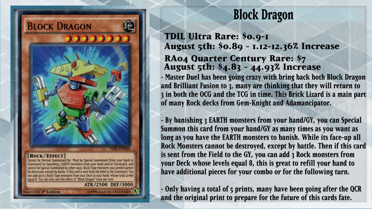 With Master Duel releasing Block Dragon straight from Limited to Unlimited, many players have been talking about what the TCG will do for this card. With the OCG currently having it Limited, and with Adamancipators’ performance not doing too well within MD/OCG itself, plenty of players have been wanting this card to be limited once again over the past few years. This card alone can add up to 3 Rock monsters, whose total Levels equal 8, from your Deck to your hand when Block Dragon is sent from the field to the GY. This is extremely powerful in most cases, but with how the format has adjusted, Rock Decks struggle with multiple interruptions via effects that activate in the hand and other types of interactions. Being able to Special Summon Block Dragon as many times as you want is great, at the cost of banishing 3 EARTH monsters from your hand and/or GY each time. It gives you additional Link Materials or helps you access Level 10 Synchro Monsters.