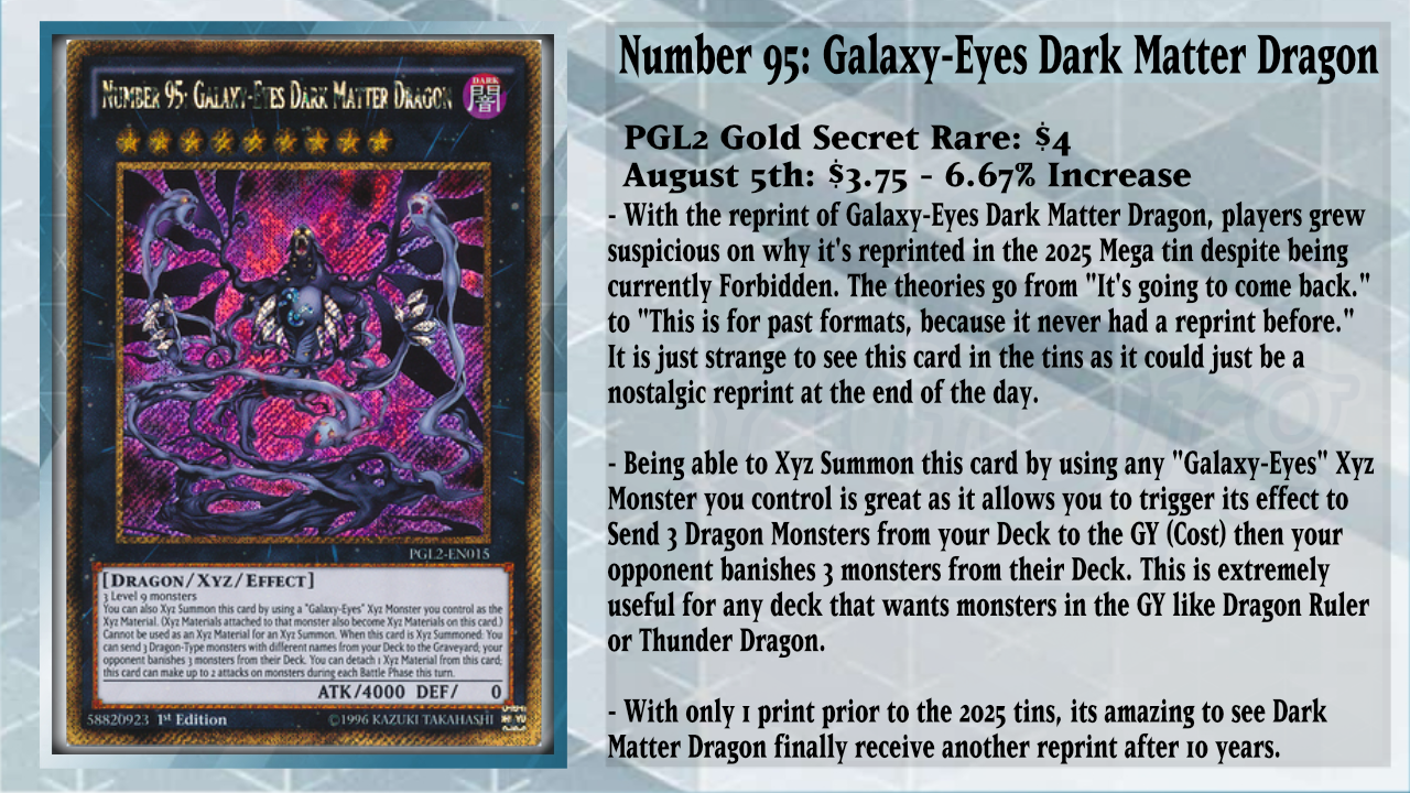 Number 95: Galaxy-Eyes Dark Matter Dragon was spotted in the Ultra Rare slots of this year’s 2025 Mega Tin, and it’s interesting to see, since this is the first ever reprint this card has seen over the past 10 years since its release in Premium Gold: Return of the Bling. When this card was first released, everyone was running to get copies of this card for Mythic Rulers, turned to Dark Matter Rulers, and only had 2 weeks to use it, as on the April 1st, 2015 list, all 4 Dragon Rulers, Blaster, Redox, Tempest, and Tidal, were all slain and put on the Forbidden section, while all of their baby counterparts went straight to 3. For a while, Dark Matter Dragon didn’t do much; it was only seen in a Dragon list from time to time until it was hit for the April 2019 list, where it was finally Forbidden due to the Amorphage Goliath/Arkbrave Dragon combo, where it locks both players out of Special Summoning non-Amorphage monsters from the Extra Deck while Amorphage Goliath is on the field, thanks to one of the many versions of Thunder Dragons at the time.