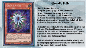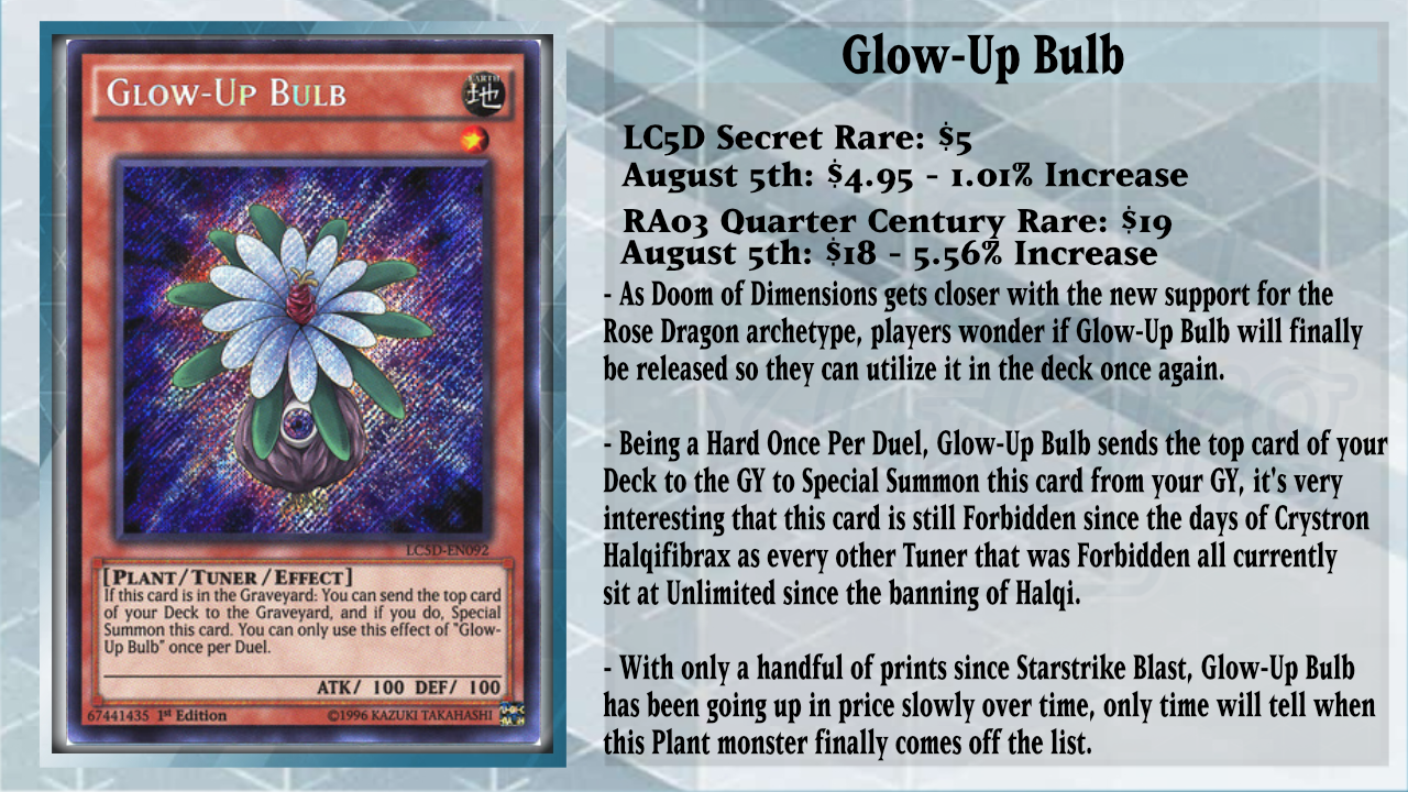 Rose Dragon stole the show in Doom of Dimensions, as it gives new options of how to play the deck, and one key piece is missing: Glow-Up Bulb. This Level 1 Plant Tuner has been Forbidden since April 2020 due to Crystron Halqifibrax being the best Link Monster in the game at the time, but it’s been nearly 3 years since the banning of Halqifibrax itself, and by happenstance, Bulb is the last card still on the list due to what this card does to the metagame. With Glow-Up Bulb itself, you can send the top card of your Deck to the GY to Special Summon it from your GY, though this is an effect you can only use once per Duel. So it is crazy to think a card like this is still Forbidden for unknown reasons. It would be great for this card to come off the list to help the Rose Dragon Deck, as they have a brand new Synchro Monster, Hate Rose Witch (YGOrganization Translation), which can send up to 2 Plant monsters to the GY, 1 from your Deck and/or 1 from your Extra Deck. This can help you access Black Rose Dragon or Bramble Rose Dragon (YGOrganization Translation) thanks to Hate Rose Witch (YGOrganization Translation) being a Level 6 monster.
