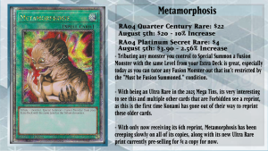 With the game ever-changing and new Fusion Monsters always being added to the game each year, this comes into question: Why was Metamorphosis reprinted in the 2025 Mega Tins? Having been currently Forbidden for the past 18 years, many wonder how it would fare in today’s game. By tributing a monster that has a Level, you can Special Summon 1 Fusion Monster from your Extra Deck with the same Level. This could help Decks that utilize Horus monsters or other Level 8 monsters to Special Summon Red-Eyes Dark Dragoon or many other powerful Fusion Monsters. While some Fusion Monsters are able to be summoned with Metamorphosis, you have to be extra cautious with some, as they would have the phrase “Must be Fusion Summoned” as a way to prevent this interaction from happening. Another interesting thing about this card is that there is 1 Effect Monster, which was originally a Fusion Monster from the Yu-Gi-Oh! GX Anime, that must be Special Summoned with this card, that being Elemental HERO Neo Bubbleman, which can be brought out by sending a copy of Metamorphosis in your hand and 1 Elemental HERO Bubbleman from your field to the GY. In addition, it destroys any opponent’s monster it battles at the end of the Damage Step, so it truly makes an old card playable once again.