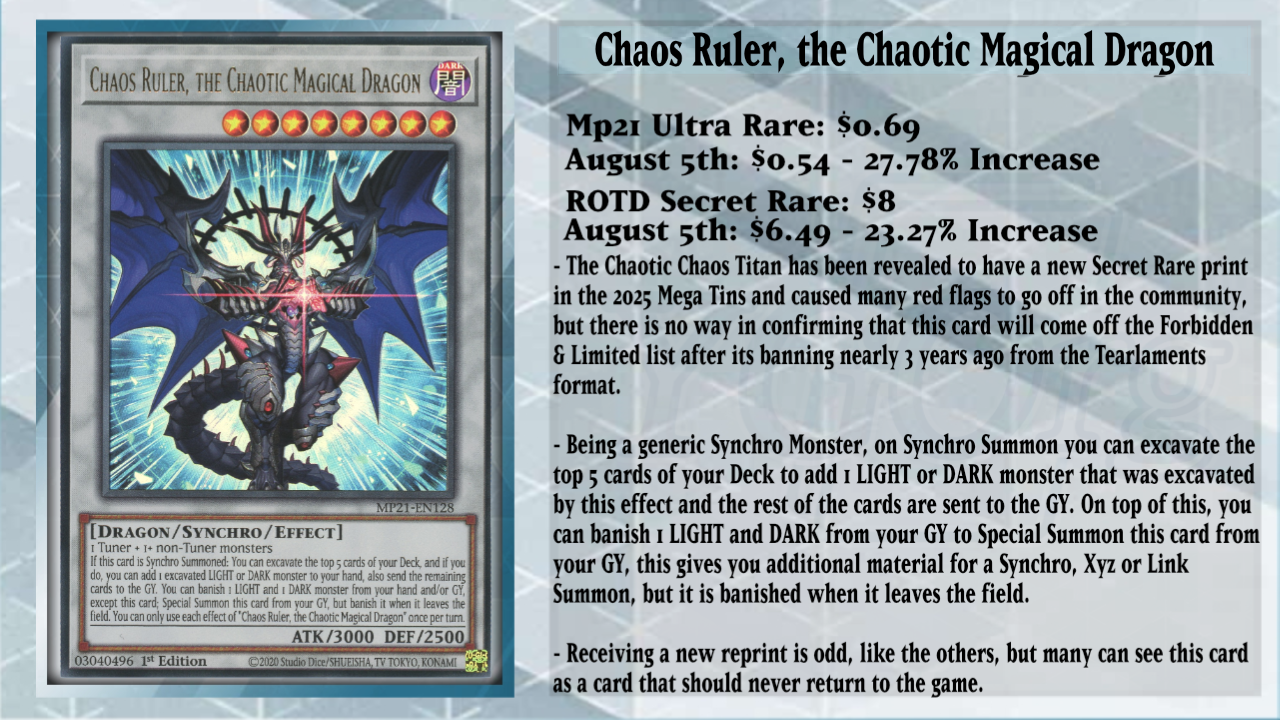 Chaos has reigned before with Chaos Ruler, the Chaotic Magical Dragon, as it was put onto the Forbidden and Limited list in October 2022 right before the Ishizu cards were released in Magnificent Mavens. It has been slumbering for almost the past 3 years for how much power and utility this card has, especially its first effect. If you Synchro Summon it, you can excavate the top 5 cards of your Deck and add 1 excavated LIGHT or DARK monster, then you send the other cards to the GY. This was extremely powerful, as you can help thin your Deck out so you can hit additional Tearlaments cards to allow you to access plenty of Fusion Monsters from Tearlaments Kitkallos, Tearlaments Kaleido-Heart, and Predaplant Dragostapelia.