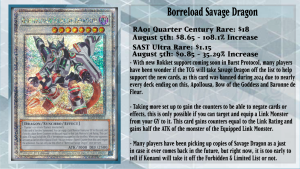 With Rokkets receiving support in Burst Protocol, players have been anticipating the return of Borreload Savage Dragon in the TCG to help Dragon Link return to somewhat… a former glory that it once had. Back in 2024, the TCG banned this card due to nearly every Deck ending on this card, Apollousa, Bow of the Goddess, and/or Baronne de Fleur, and as such, Konami had to take action to force players to end on different endboards for every deck. But many say that Borreload Savage Dragon was wrongfully banned, as it wasn’t as oppressive or a big offender as the other two mentioned since you had to put more resources into the Synchro Summon and make sure to have a Link Monster in the GY for it to gain counters for its negations. But hopefully by the time that the TCG receives Burst Protocol, Savage will have finally returned to us, so many Decks can utilize it again.