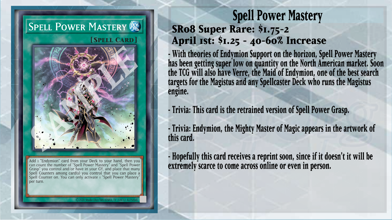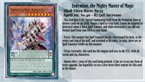 Every master of magic needs to have their most powerful Spell, and this one is Spell Power Mastery. This card adds any Endymion card from your Deck to your hand, then you count the number of Spell Power Mastery and Grasp you control and/or in your GY and place that many Spell Counters among cards you control that can have Spell Counters on them. This is great for searching for your Servant of Endymion, Endymion, the Mighty Master of Magic himself, or even the yet-to-be-released Verre, the Maid of Endymion (YGOrganization) as a powerful starter for the Spellcaster Pile.
