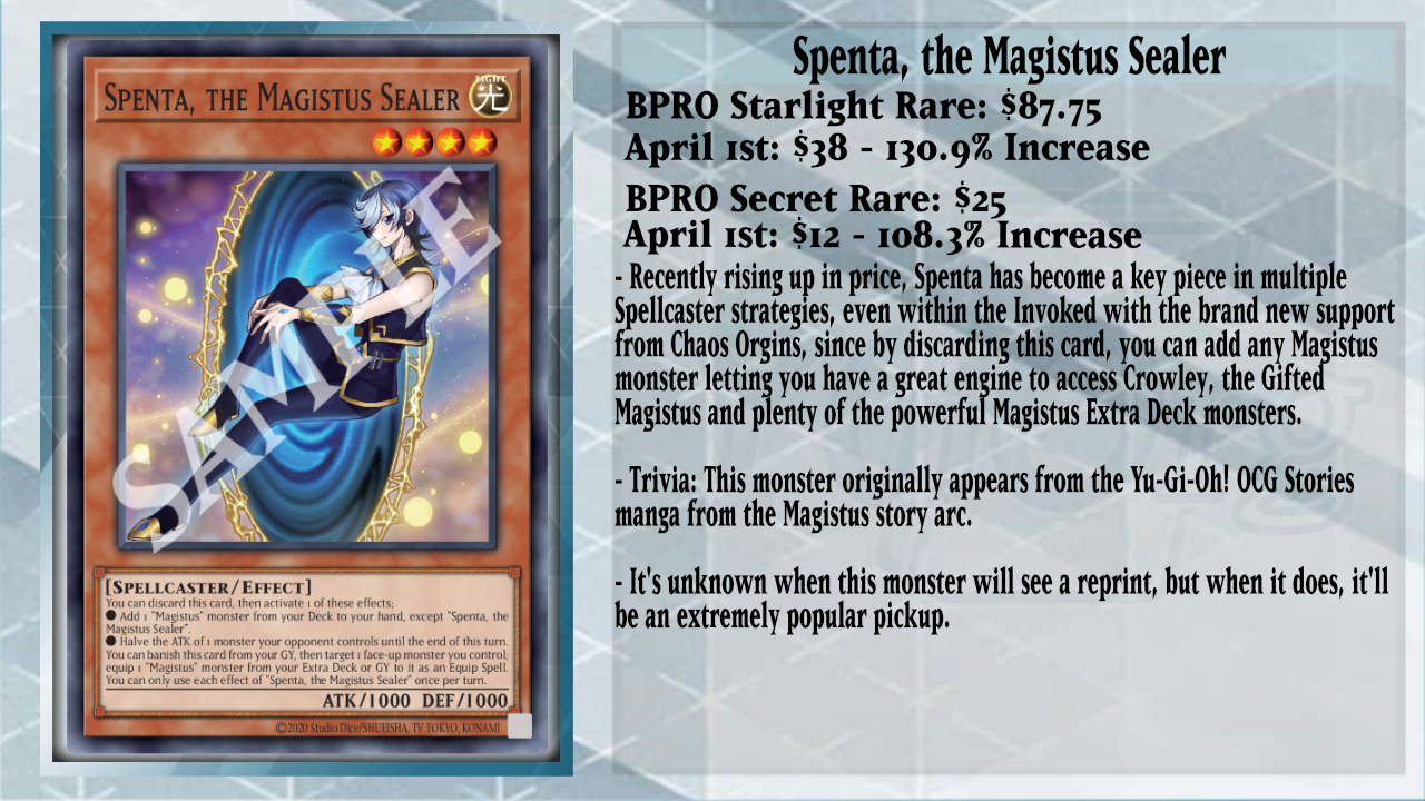 Everyone’s favorite Spoon, Spenta, the Magistus Sealer has gone up in price due to the Spellcaster hype as each theme can use the Magistus engine efficiently to set up interruptions on the opponent’s turn, but can also provide multiple combo routes before you are locked into the theme itself like Witchcrafter, or locked into Fusion Monsters with Invoked. By discarding this card, you can add any other Magistus monster from your Deck to your hand or halve the ATK of 1 monster your opponent controls until the end of that turn. While this card is in your GY, you can banish it to target 1 face-up monster you control and equip 1 Magistus monster from your Extra Deck or GY to it as an Equip Spell, lining you up for a play with Magistus Chorozo or Snake-Eyes Doomed Dragon.